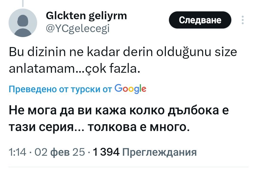 Мистери, видяното в края на 89 еп. си беше "докосване" на Суна, така че предпоставките - дали е бил с други жени след като е сключил брак със Сейран или не, не е важно (както не е важно, дали е валял дъжд, или са мили улиците, щом е мокро). Но тук и самата предпоставка не е истинна - той беше с Пелин и Дияр, въпреки че искаше Сейран и само Сейран. Що се отнася до извода за харесването на Ферит ( а според други - мразенето/обичането), има хора, които гледат това, което им се показва, без да се влюбват в героя, или актьора. Което не означава, че гледат без интерес и чувства... Просто се оставят сценаристи и режисьори да ги водят в историята. Аз съм от тях. Като напиша собствена история, може и да се ядосвам на някой свой герой, а може и да страдам за него. Simple Smile