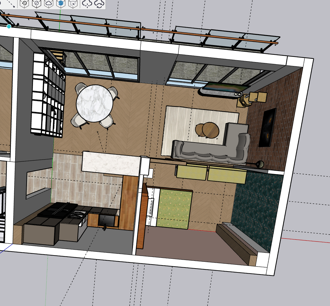 Искаше ми се падащото легло да е в другия ъгъл, далеч от кухнята, обаче там има куфар за тръбите и няма да остане място за бюрата да са до стъклената стена
