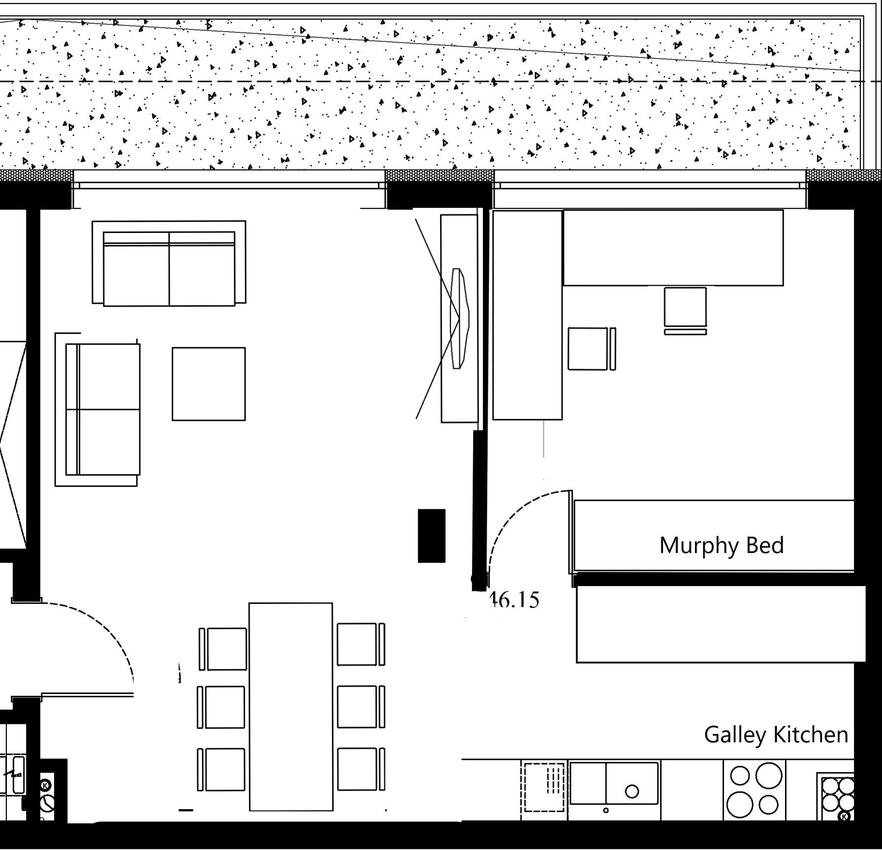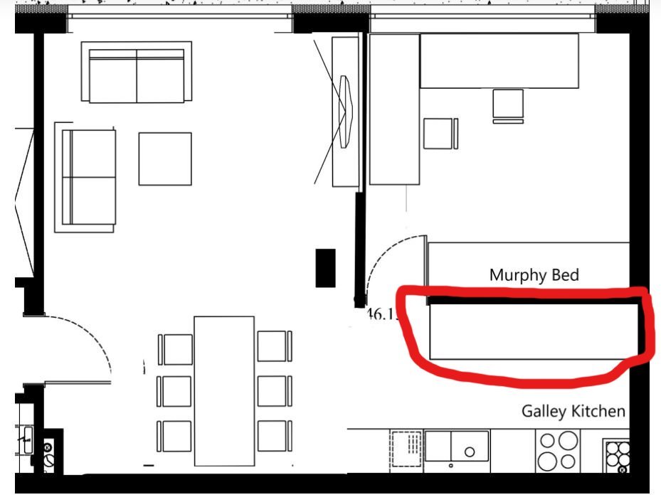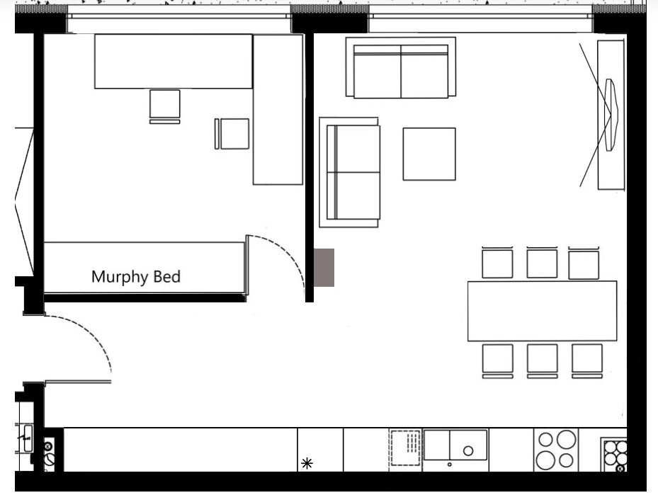 А защо стаята с леглото е срещу кухненския плот? Не е ли по-добре лявото помещение да е вдясно, а дясното - вляво, а масата да е ориентирана хоризонтално? А леглото е падащо, но сигурно ли е, че така, както е в момента, има място за изваждането му?