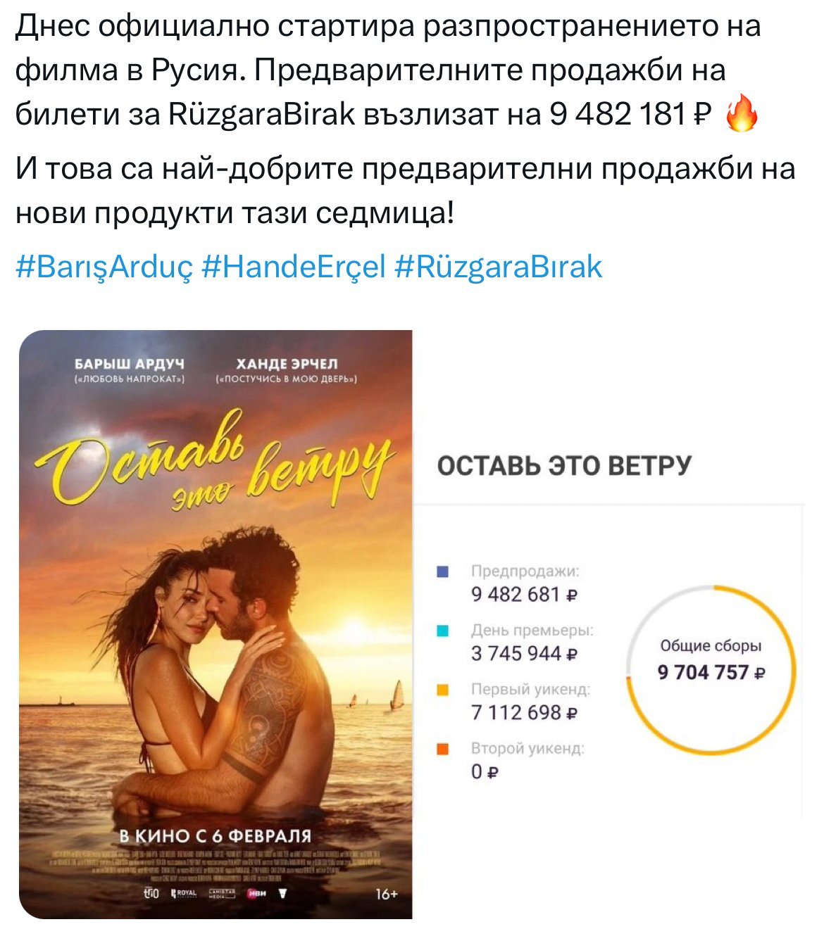 Филмът #RüzgaraBırak, с участието на #HandeErçel и #BarışArduç, ще бъде пуснат по кината на 20 февруари в Казахстан