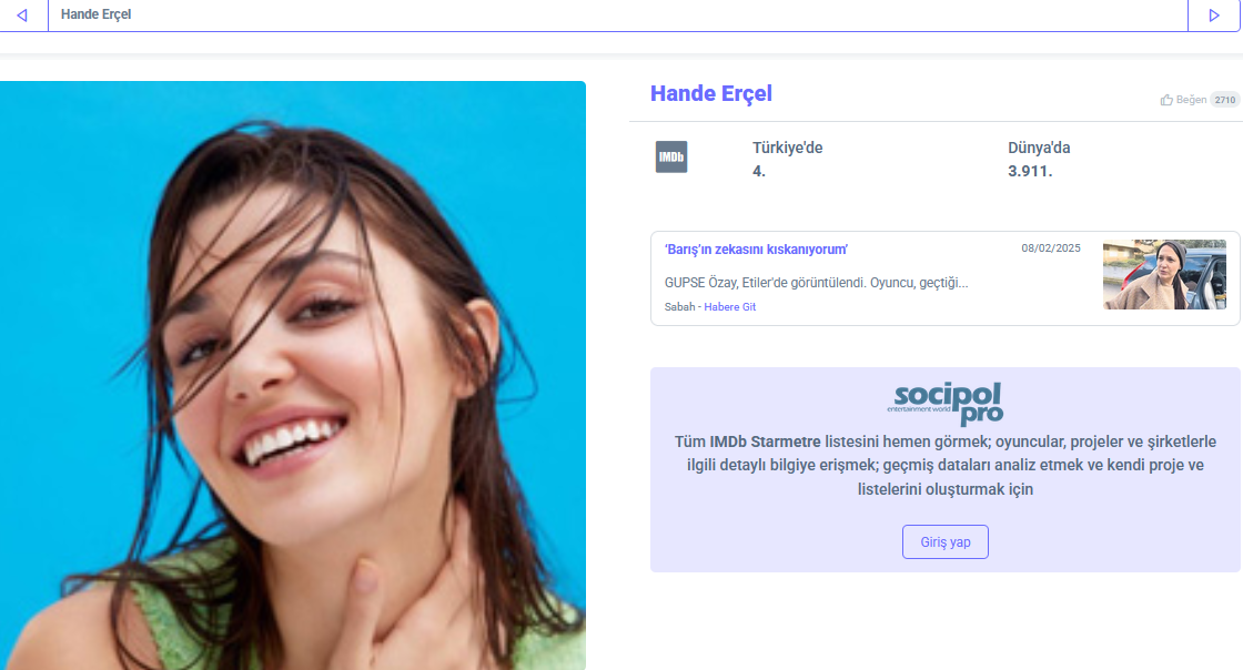 През тази седмица в IMDb STARmeter Керем заема следните позиции: