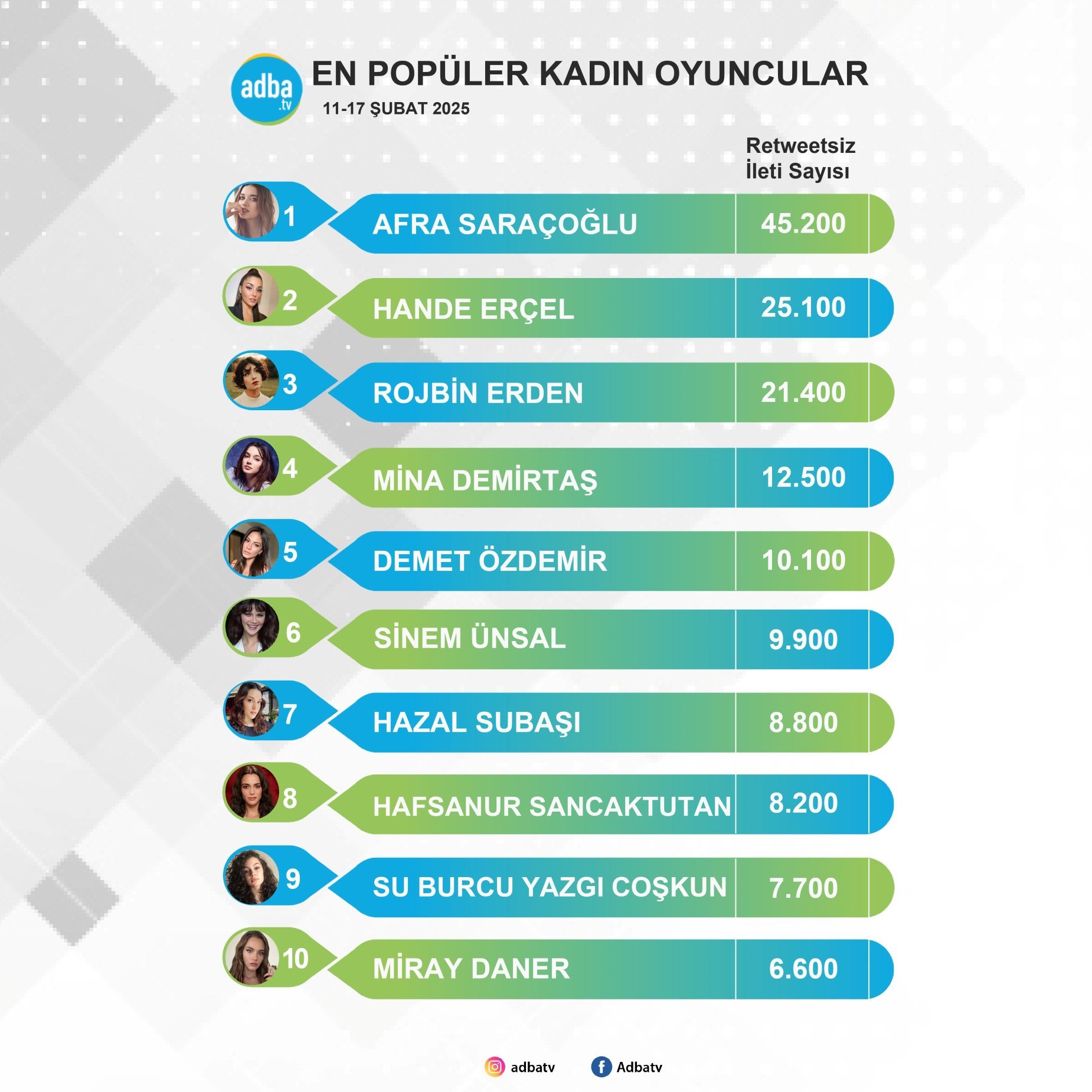 Адба обяви кои са най-популярните актриси в социалните мрежи за периода 11-17 февруари. Ханде отново е на 2-ро място.