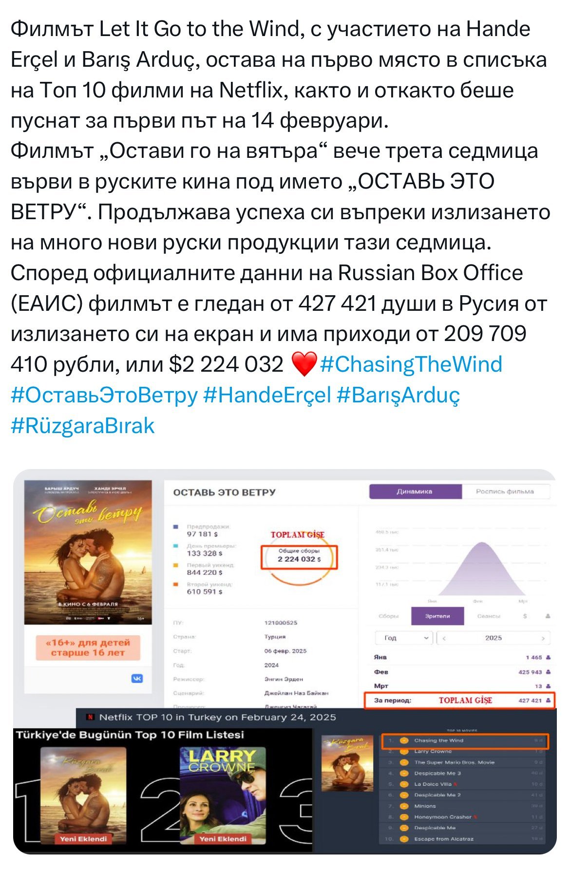 "Току-що завърших филма LeaveItToTheWind . Еге, който не мечтае да стане главен изпълнителен директор, се установява в залив в Егейско море и се посвещава на сърфиране и управление на ресторант, а от друга страна, Аслъ, която е израснала сама с баща си, защото майка й я е напуснала, когато е била на 5, е толкова отдадена на компанията, че дори няма истински приятел. Метод за бягство от семейна травма. Всъщност може да се каже, че LeaveItToTheWind е историята на двама души, които бягат от себе си и откриват един в друг кои са всъщност. И накрая, бих искал да направя своя коментар за филма относно изпълнението на Hande Erçel. След излизането на филма актьорската игра на Ханде Ерчел е критикувана в различни акаунти в социалните медии. За съжаление, хората смятат, че актьорството е просто плач, крясъци или викове. Честно казано, като човек, който е гледал по-голямата част от поредицата на Ханде Ерчел, много ми хареса как Ханде изобрази героя си. Особено в края на филма, когато се разкрива, че Аслъ всъщност е дала на компанията информация за Еге, Ханде Ерчел изобразява толкова добре смущението на Аслъ пред Еге само с очите си. Според мен няма проблеми с играта на Ханде Ерчел. Въпреки това, тъй като Ханде Ерчел обикновено играе герои с подобни личности, мисля, че хората имат впечатлението, че Ханде Ерчел не може да играе. Но най-добрият начин да разберете дали един актьор е добър актьор е да гледате други телевизионни сериали и филмови проекти, в които е играл. Защото актьорът играе различен герой във всеки сериал и след като гледате сериал или филм с актьор, когато гледате друг сериал или филм с този актьор, забравяте за стария герой на този актьор в съзнанието си. Помислете за това по този начин. Така например Ханде Ерчел за последно игра в сериала "Друг човек" миналата година. В този сериал Ханде Ерчел изигра ролята на прокурор Лейля. Спомняте ли си ролята на Ханде Ерчел като прокурор Лейля в този филм? Има ли някаква следа от стария й герой в този филм? Не. За мен това е всъщност актьорството. Лицето, което виждате на екрана, никога не се променя физически, но виждате нейните различни състояния и нагласи във всеки епизод или филм и забравяте героя, който тя изигра в предишния епизод. Накратко, тези, които критикуват представянето на Ханде Ерчел, аз лично казвам, че я критикуват несправедливо. Този филм с Ханде Ерчел ми хареса, както и всички нейни сериали и филми. Честно казано, като зрител бих искал този филм да има продължение! Лично аз бих искал да видя втория филм, където Аслъ и Еге ще разкажат как са се оженили. LeaveItToTheWind"