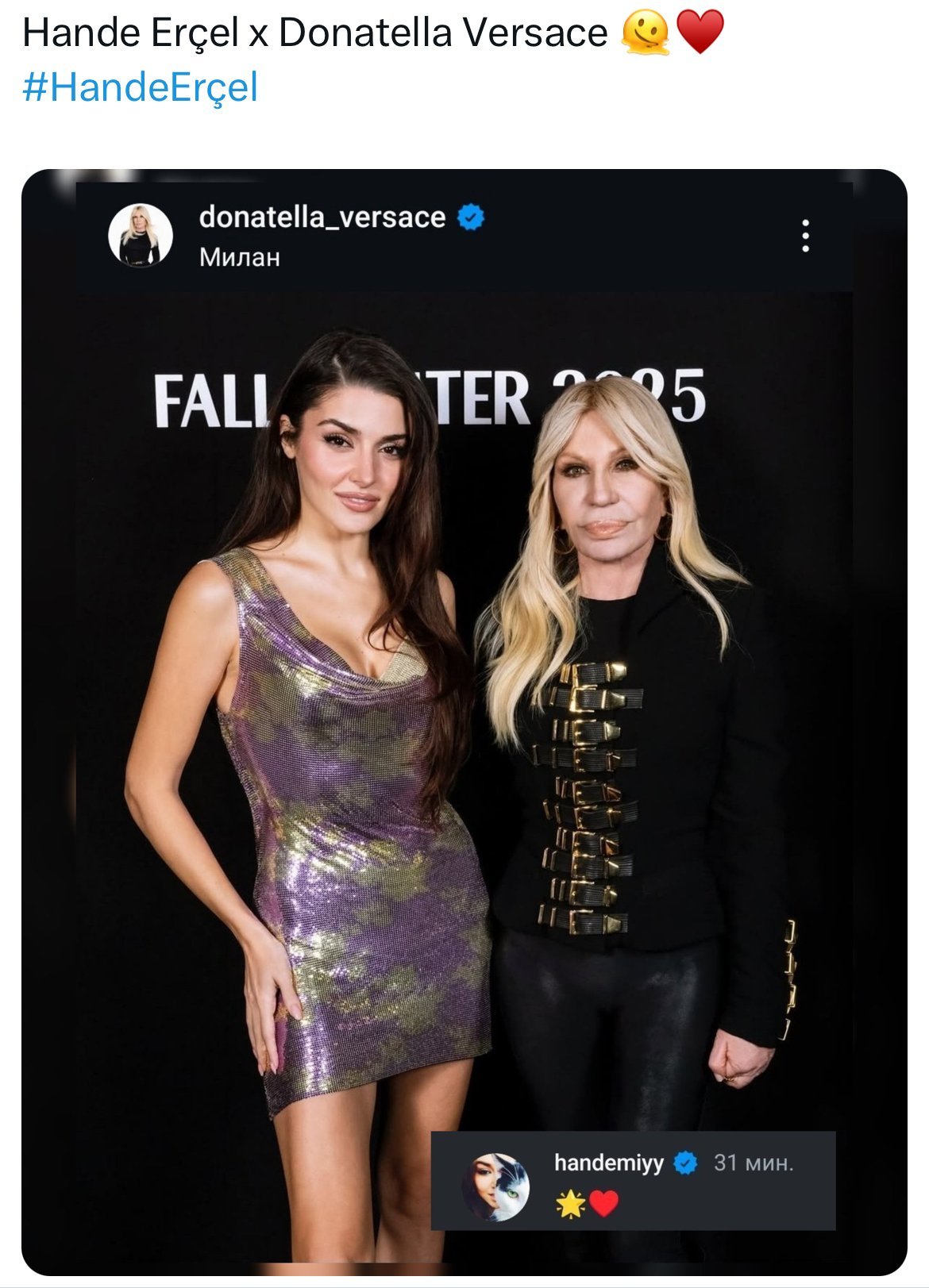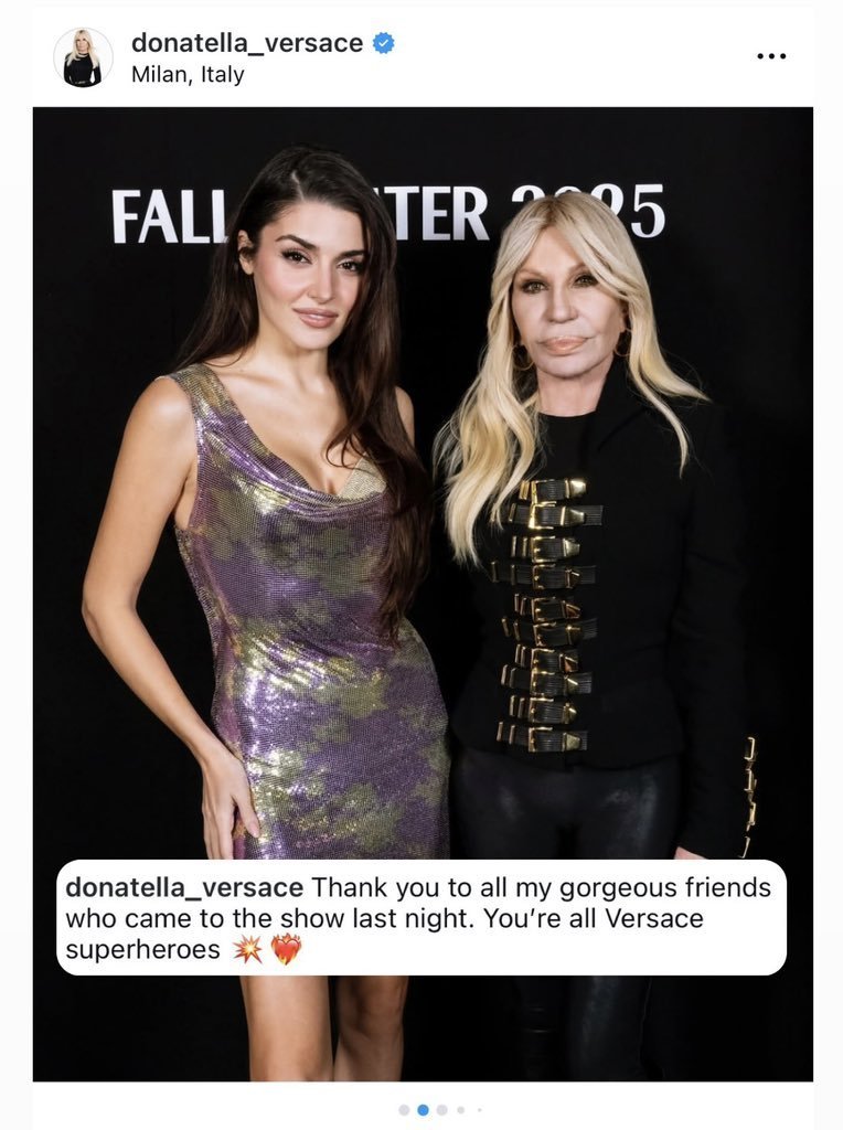 Световноизвестният моден дизайнер Донатела Версаче сподели Hande Erçel в профила си в Instagram и добави бележката: „Благодаря на всички мои прекрасни приятели, които дойдоха на модното шоу снощи. Вие всички сте супергерои на Versace.“