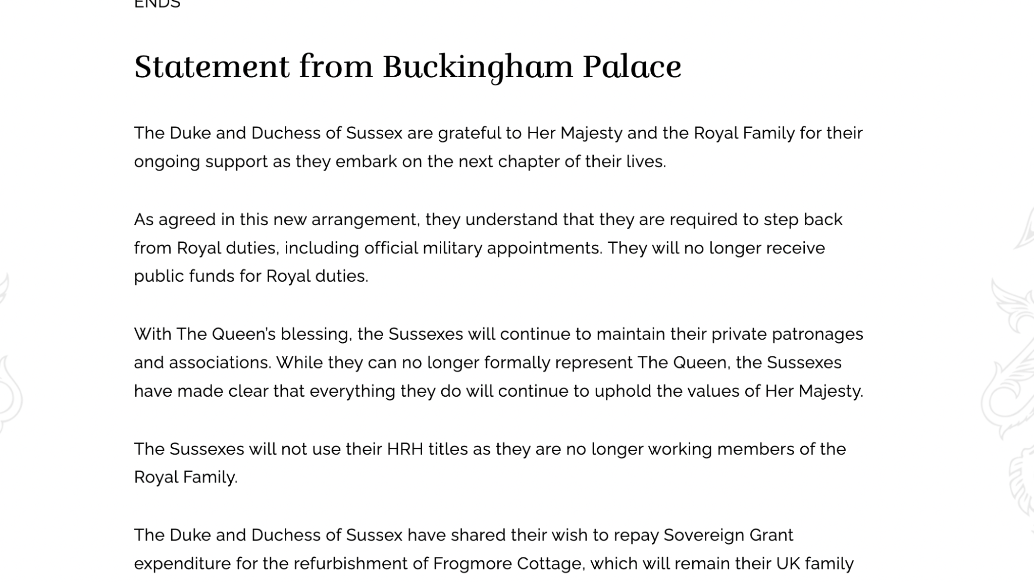 А във всички изявления от двореца изрично пише, че HRH вече не им се полага понеже не са работещи рояли, няма какво да се съгласяват по тази точка. https://www.royal.uk/statement-her-majesty-queen-0 Това го пише и на сайта на Съсекс.