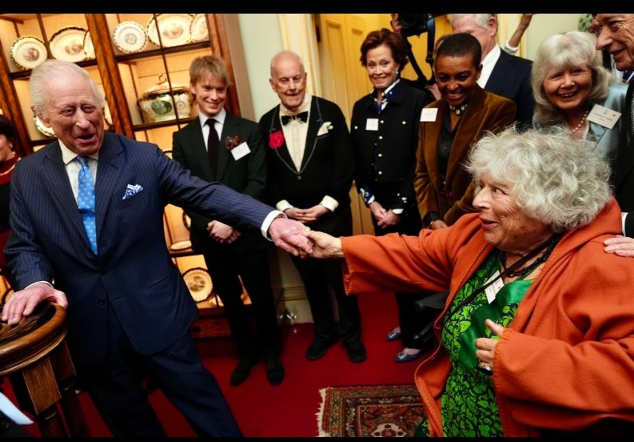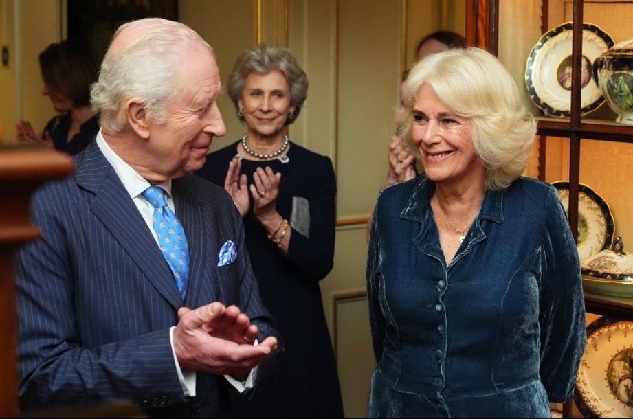 Кралица Камила и крал Чарлз III по време на прием в Clarence House за автори, членове на литературната общност и представители на The Queen's Reading Room, за да отпразнуват пускането на медала The Queen's Reading Room