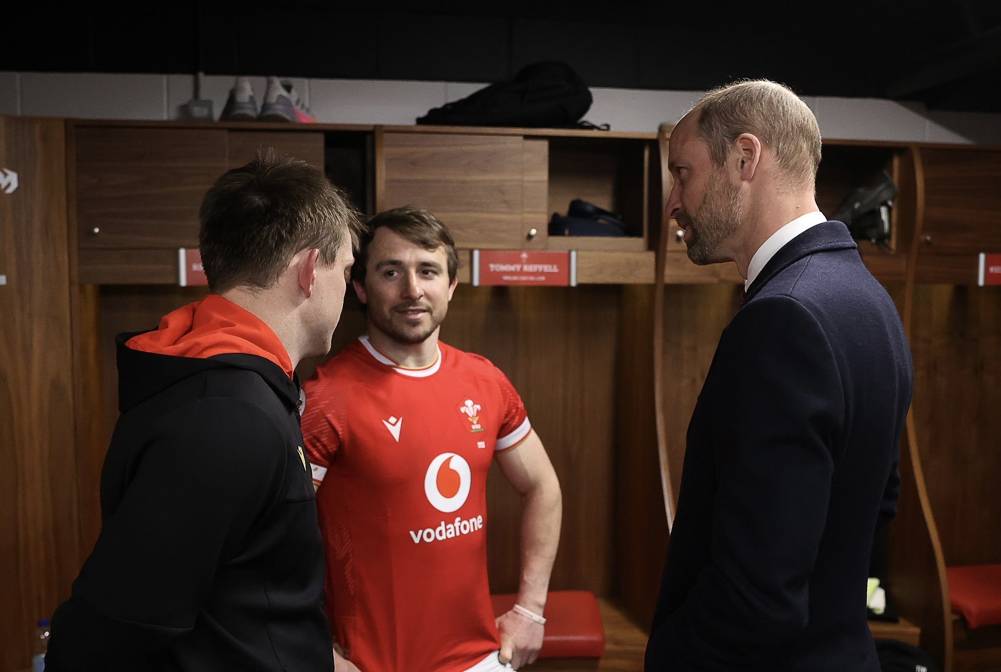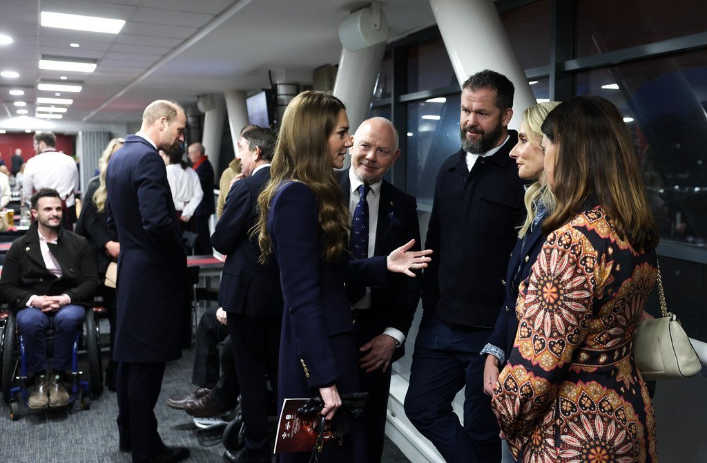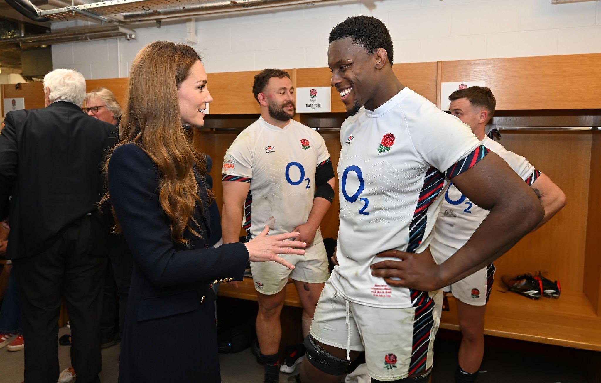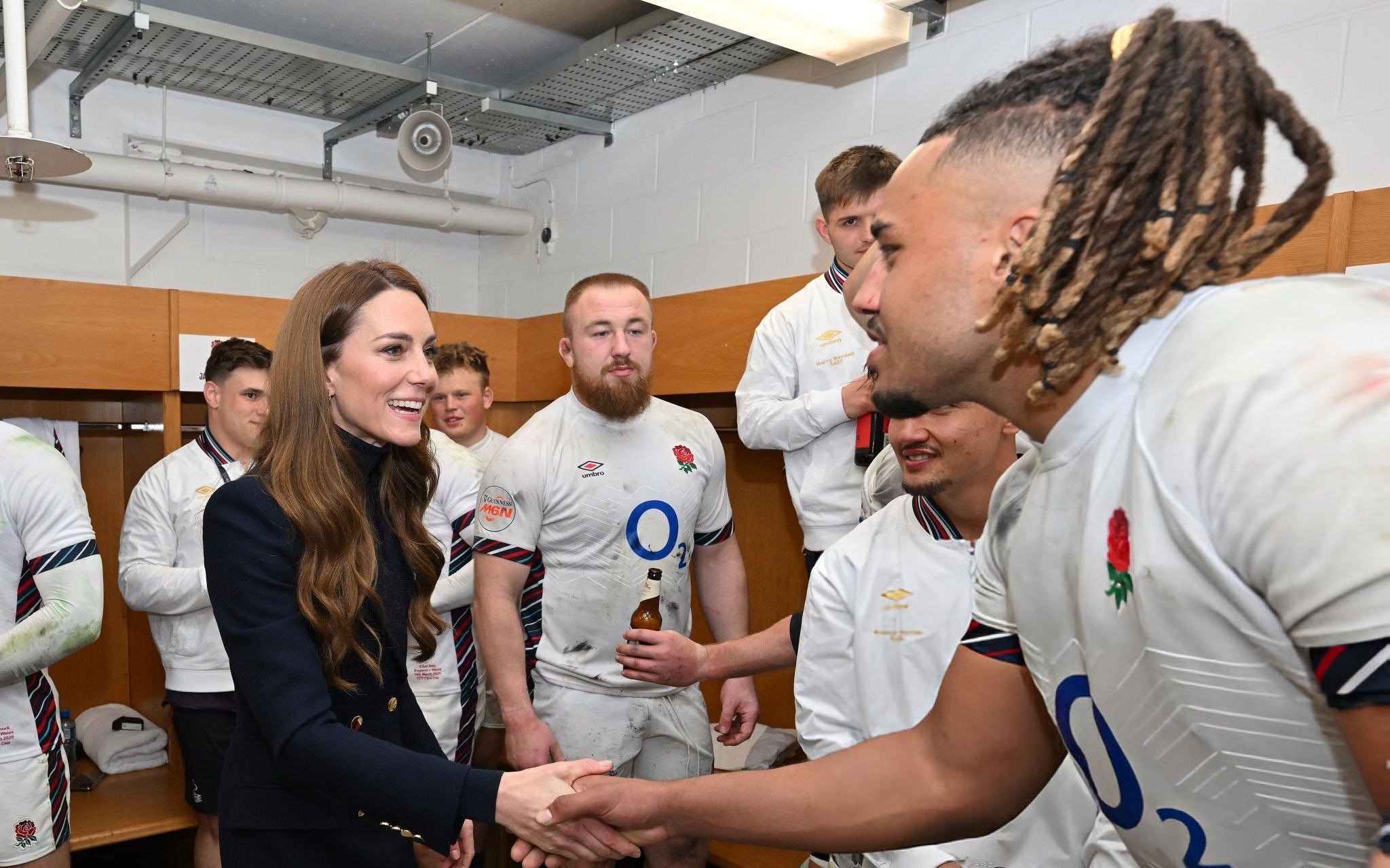 Принцесата на Уелс, патрон на Футболния съюз по ръгби (RFU), разговаря с Джейми Джордж, Хенри Полок, Маро Итодже и Чандлър Кънингам-Южна Англия в съблекалнята след мача на Гинес Шестте нации 2025 между Уелс и Англия на стадион Принсипалити.