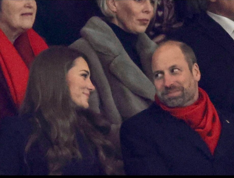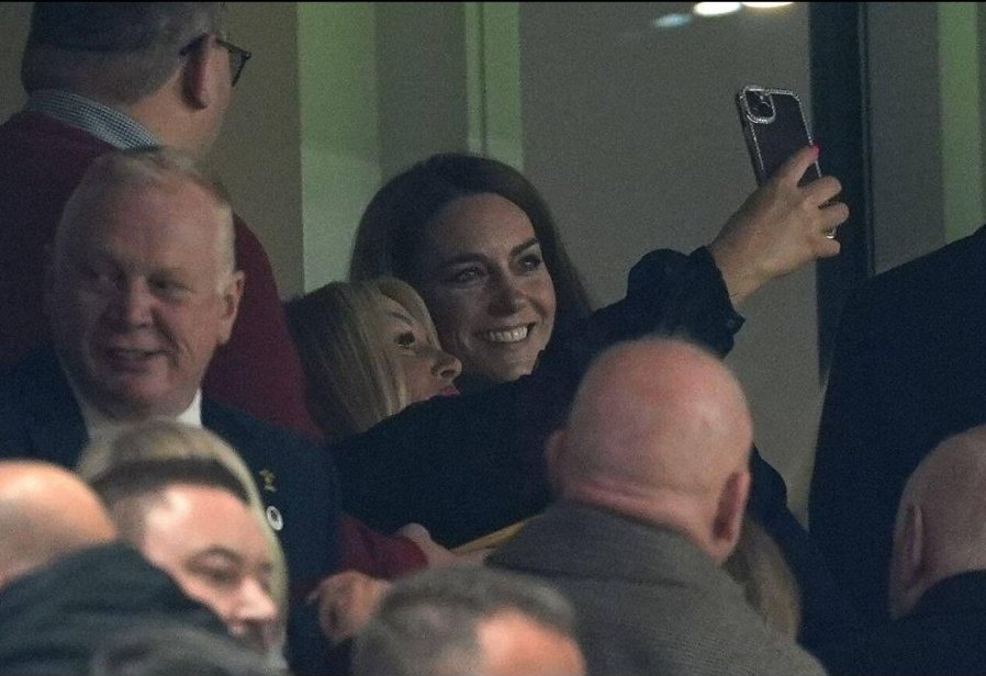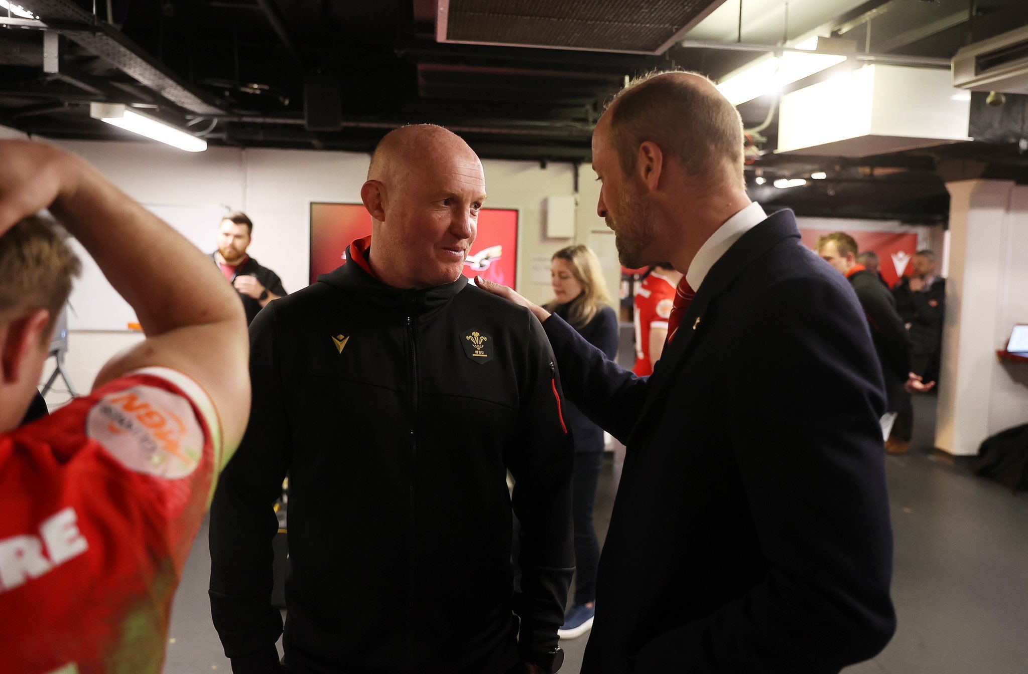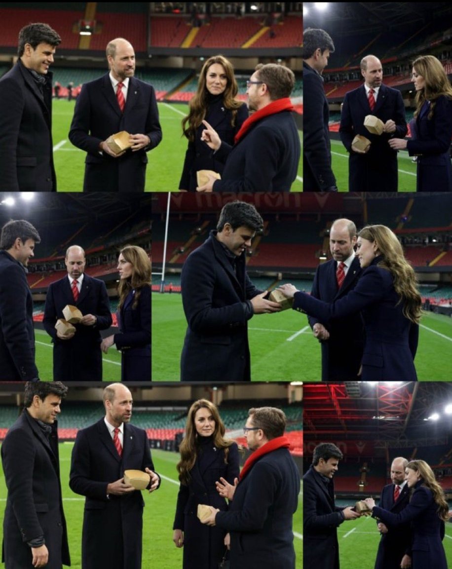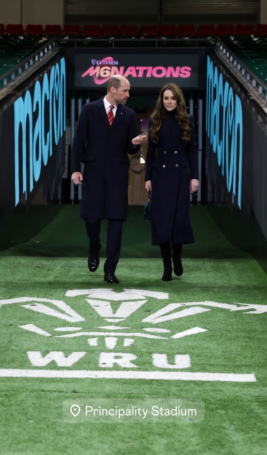 Принцесата на Уелс, патрон на Футболния съюз по ръгби (RFU), разговаря с Джейми Джордж, Хенри Полок, Маро Итодже и Чандлър Кънингам-Южна Англия в съблекалнята след мача на Гинес Шестте нации 2025 между Уелс и Англия на стадион Принсипалити.
