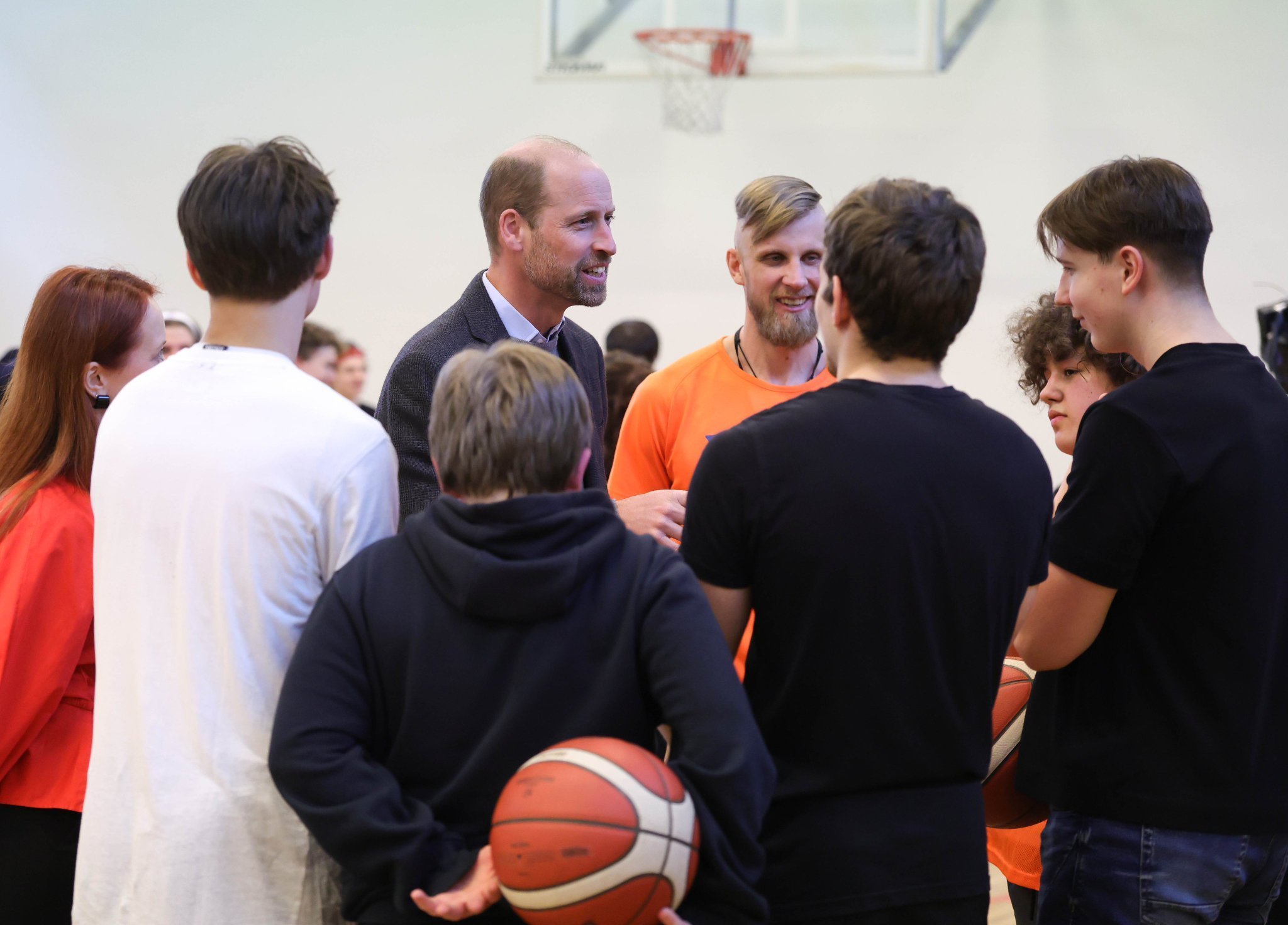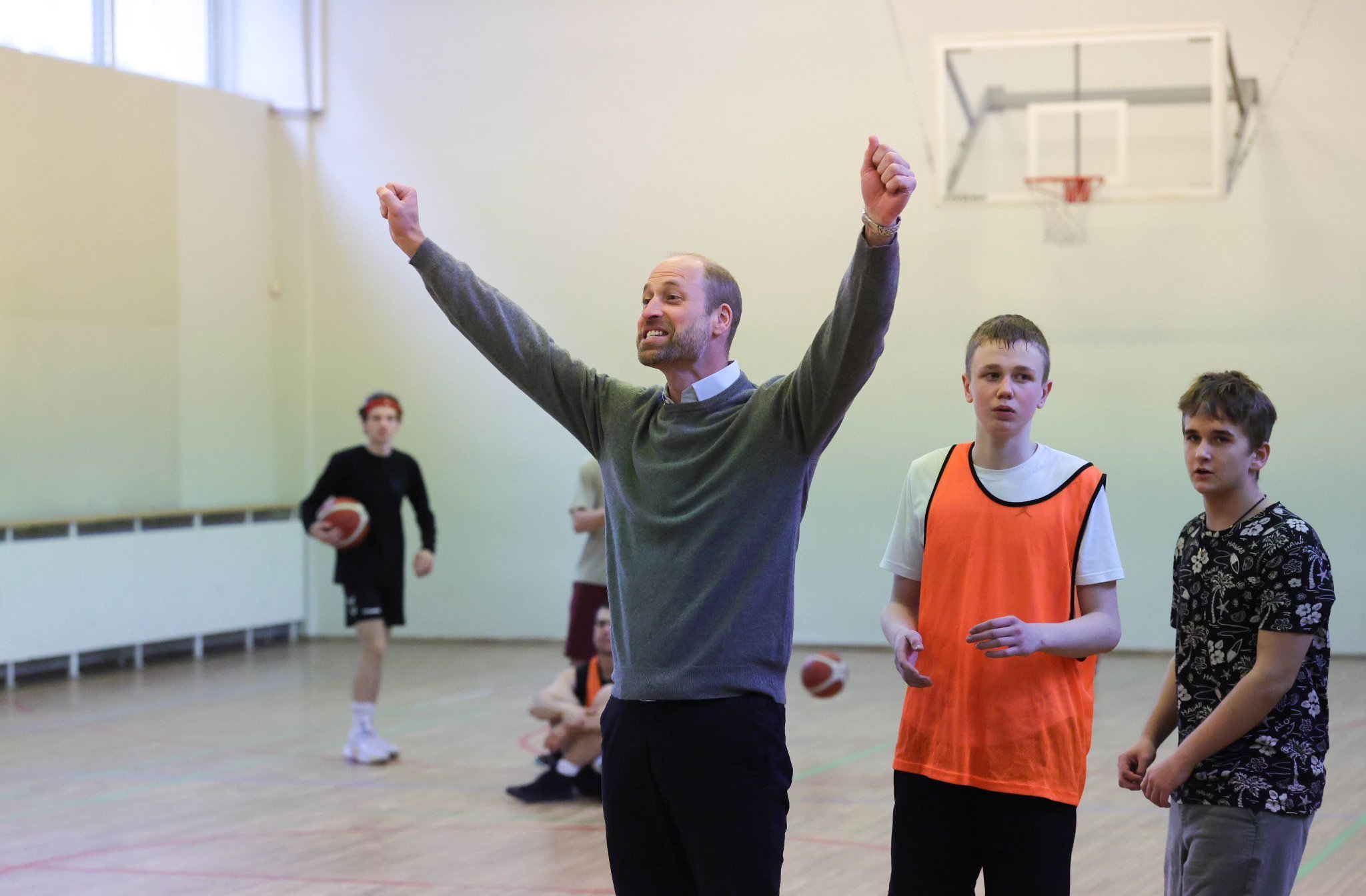 Принцът на Уелс участва в баскетболни тренировки по време на посещение в училището Freedom School, което беше основано от Министерството на образованието и научните изследвания на Естония през май 2022 г., за да отговори на войната в Украйна.