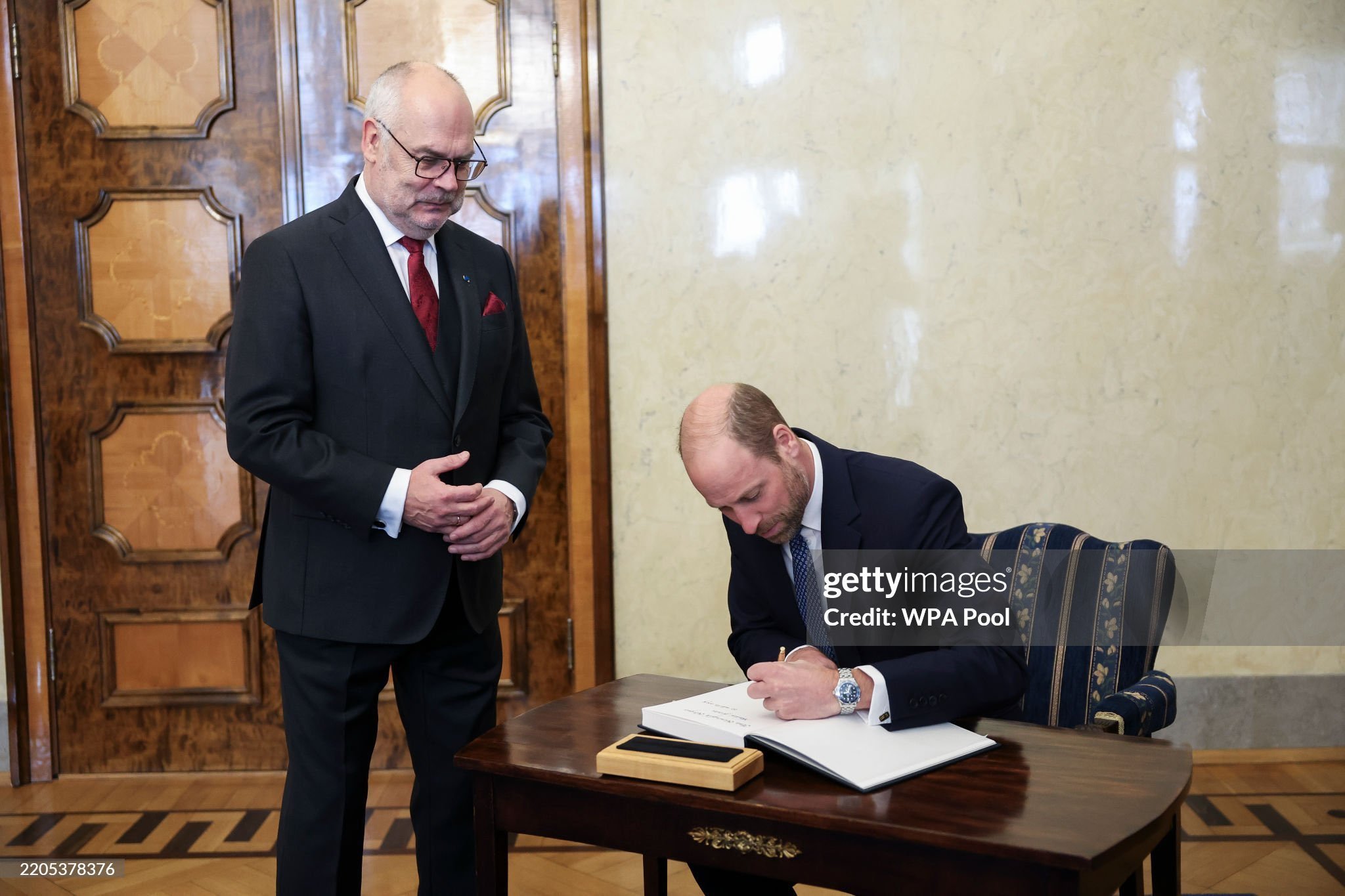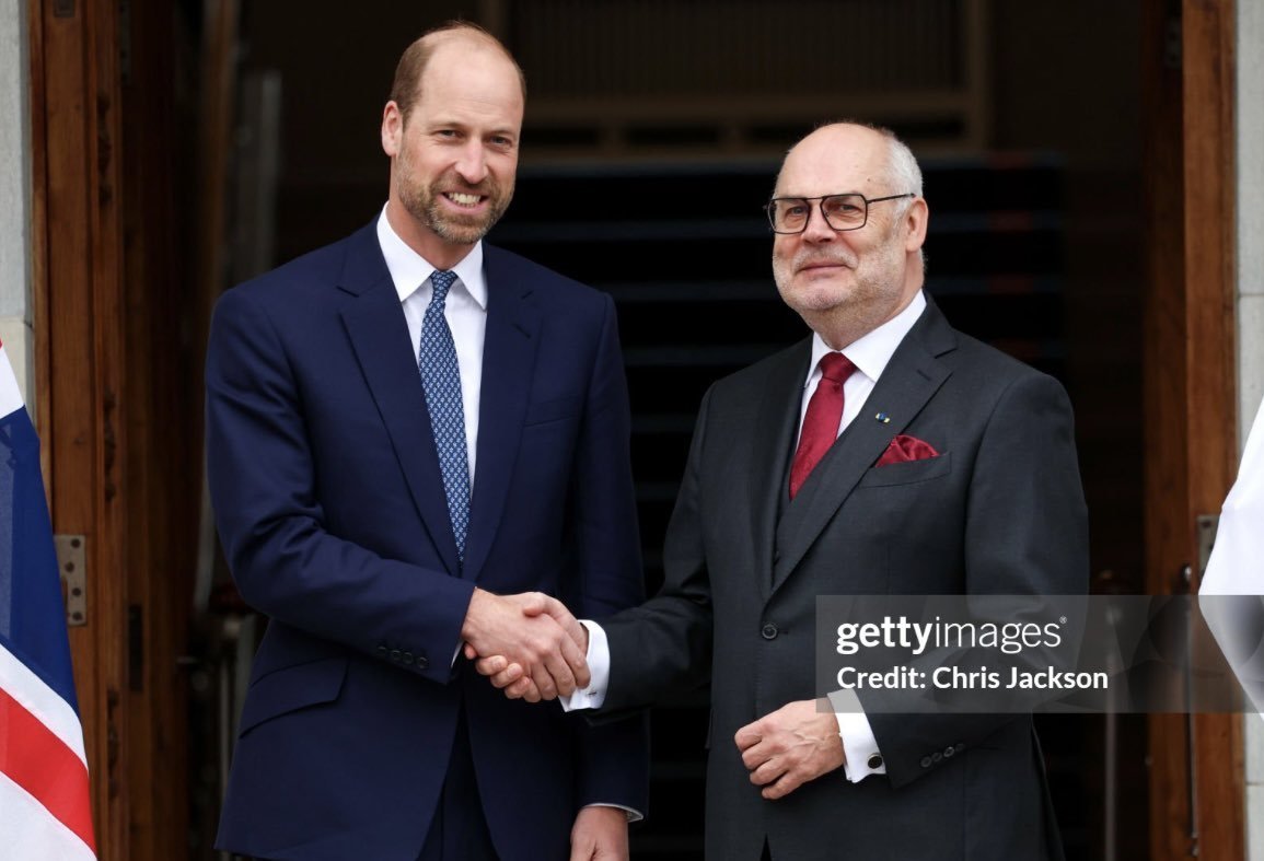 Принц Уилям пристигна в Естония, където първата му спирка беше в президентския офис за частна среща с президента Алар Карис - вероятно за да обхване всичко най-ново за Украйна. Той получи плюшена играчка от местни ученици, преди да влезе вътре.