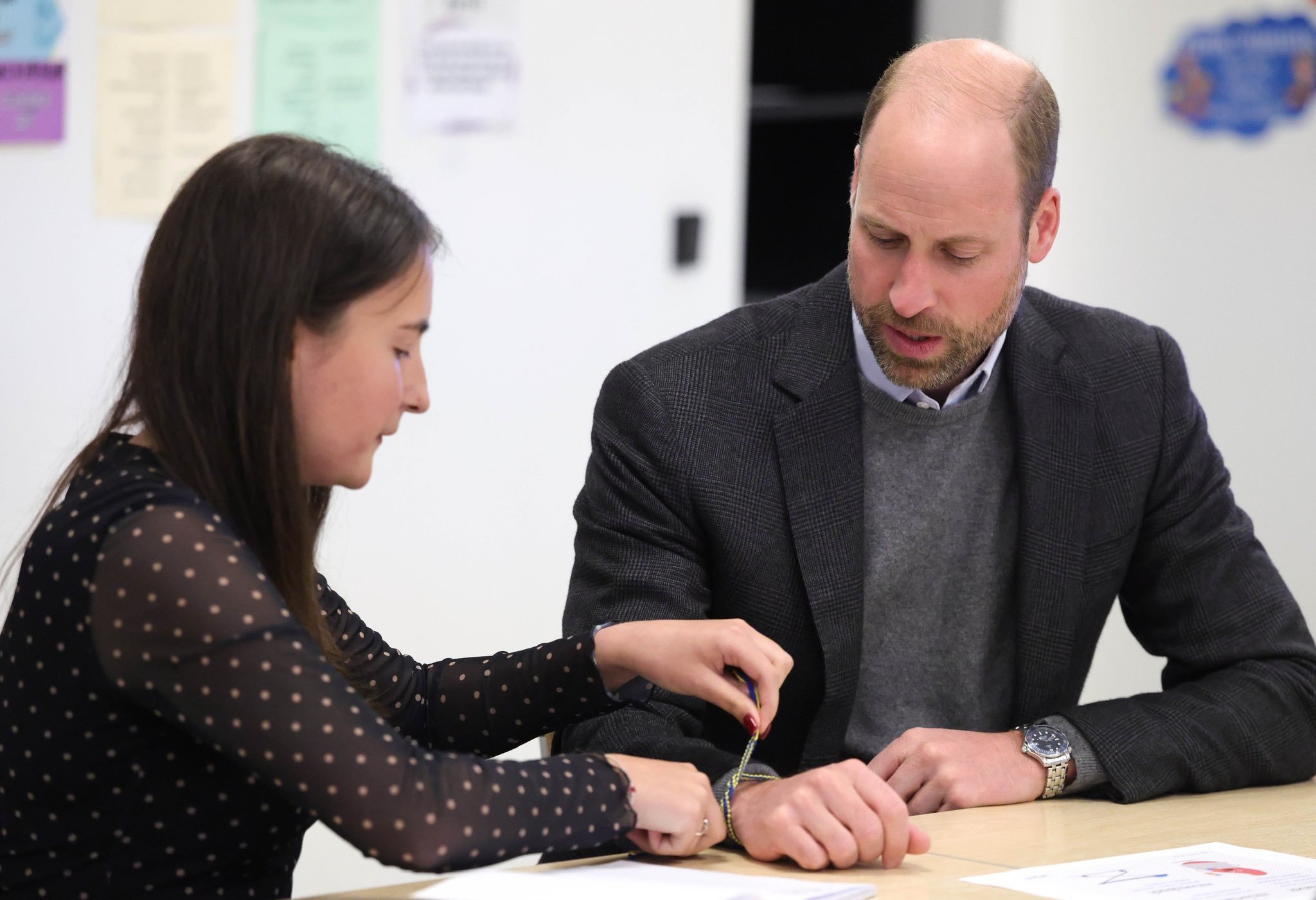 Принцът на Уелс приема гривна за приятелство в синьо и жълто, която според него принцеса Шарлот вероятно ще открадне, по време на посещение в училището на свободата в Талин, Естония днес.