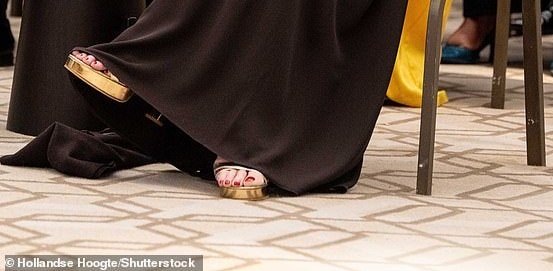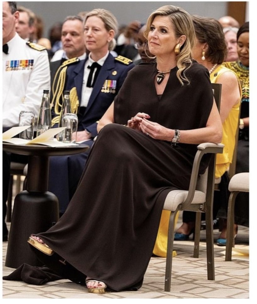 Максима пак разочарова с модните си решения - тези обувки очевидно са неточен номер, щом без да е изправена на крака пръстите й стърчат извън обувките. Като е изправена ще излизат още повече.