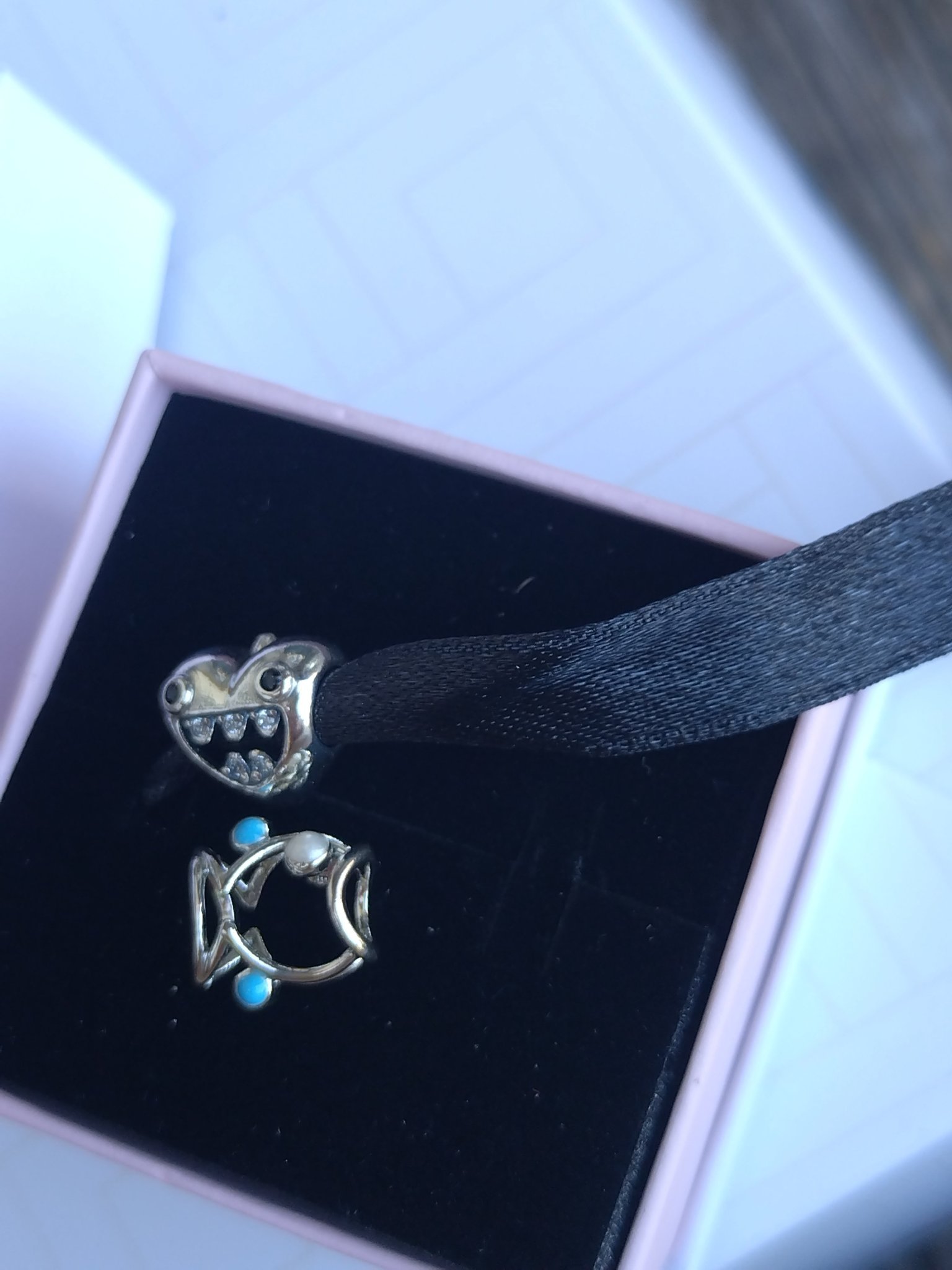 Дами, от днес в немската Пандора започна предварителната разпродажба за клубни членове и мисля да си взема нещо по-лятно 🙂 Според вас към тази рибка, кой талисман би подхождал повече - сините вълни или другият с мидичките 🤔