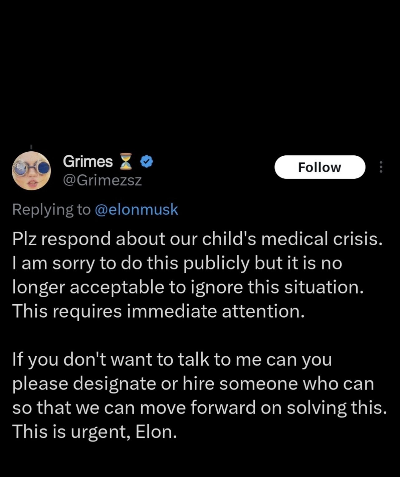 Гриймс с два обезпокоителни туита, които са изтрити по късно или след обаждане от адвокат или по нареждане на Мъск.