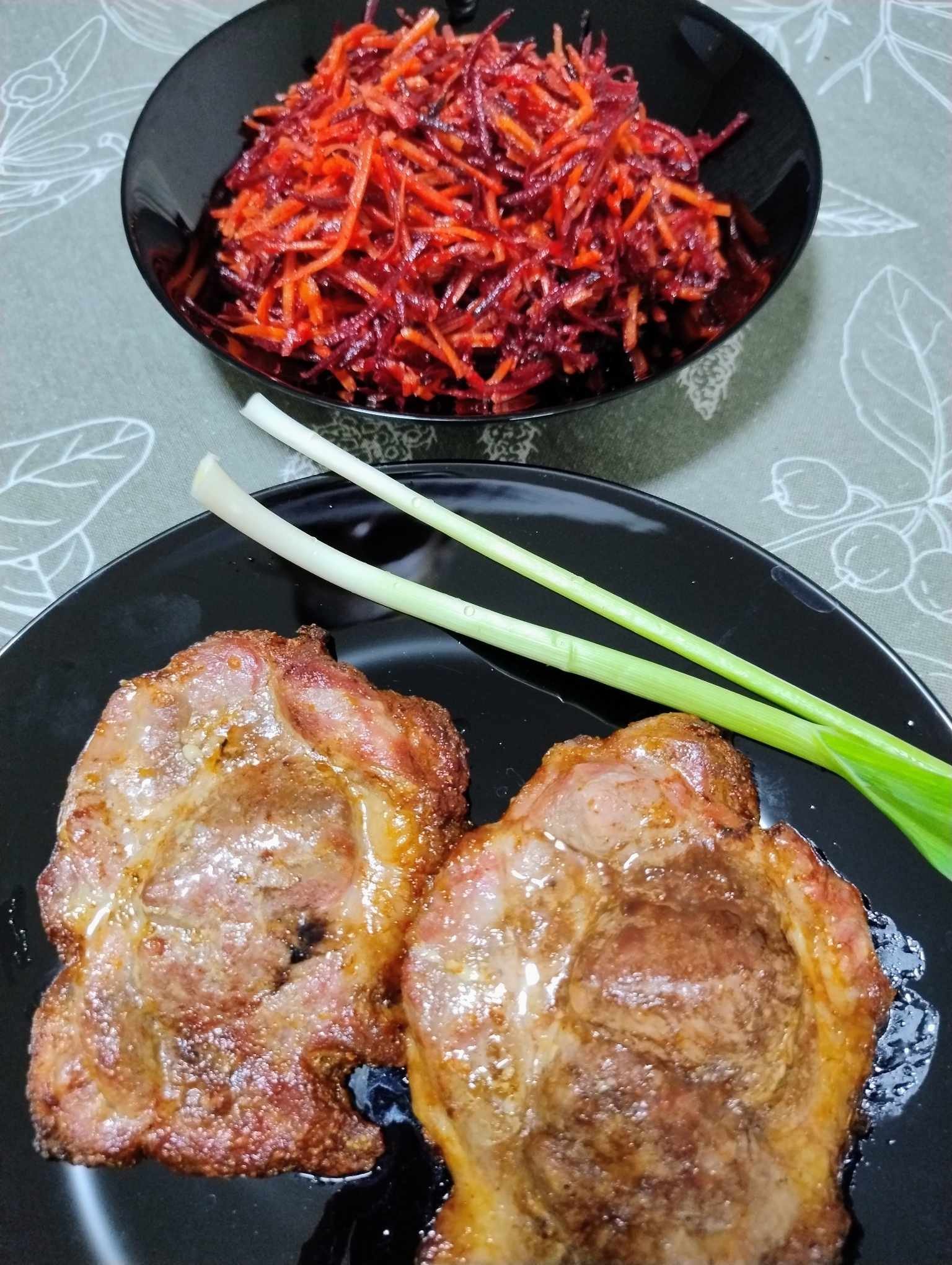 Ииии по случай добрата новина днес, си сипнах червено винце, гарнирано с два вратни пържолака и салата цвекло.