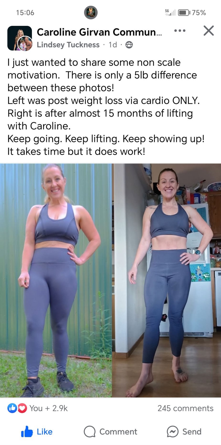 Увеличих си калориите откакто почнах сериозна програма с тежести и почнах да отслабвам повече. Та Брия, по този повод, карай го по-полека. Малко ядеш и много тренираш. Кардиото само вдига кортизола, зарежи го. 25кг свалих само със силови и ходене. И стабилно ядене. Тялото изглежда по съвсем различен начин също така. Когато бягах маратони и главно кардио правех нямах такава дефиниция като сега. Погледни и скрития текст, от групата на Каролайн Гирван  за тренировки
