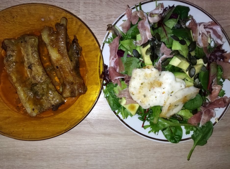 Ние вечеряхме преди малко. Имахме няколко неща, между които да избираме, защото ни остана хапване от вчера и от обяд (пиле "Жулиен", омлет със сирене, маслини и кашкавал и ребърца). Аз хапнах ребърцата. Зелената салата е с авокадо, тиквени семки, прошуто и козе сирене.