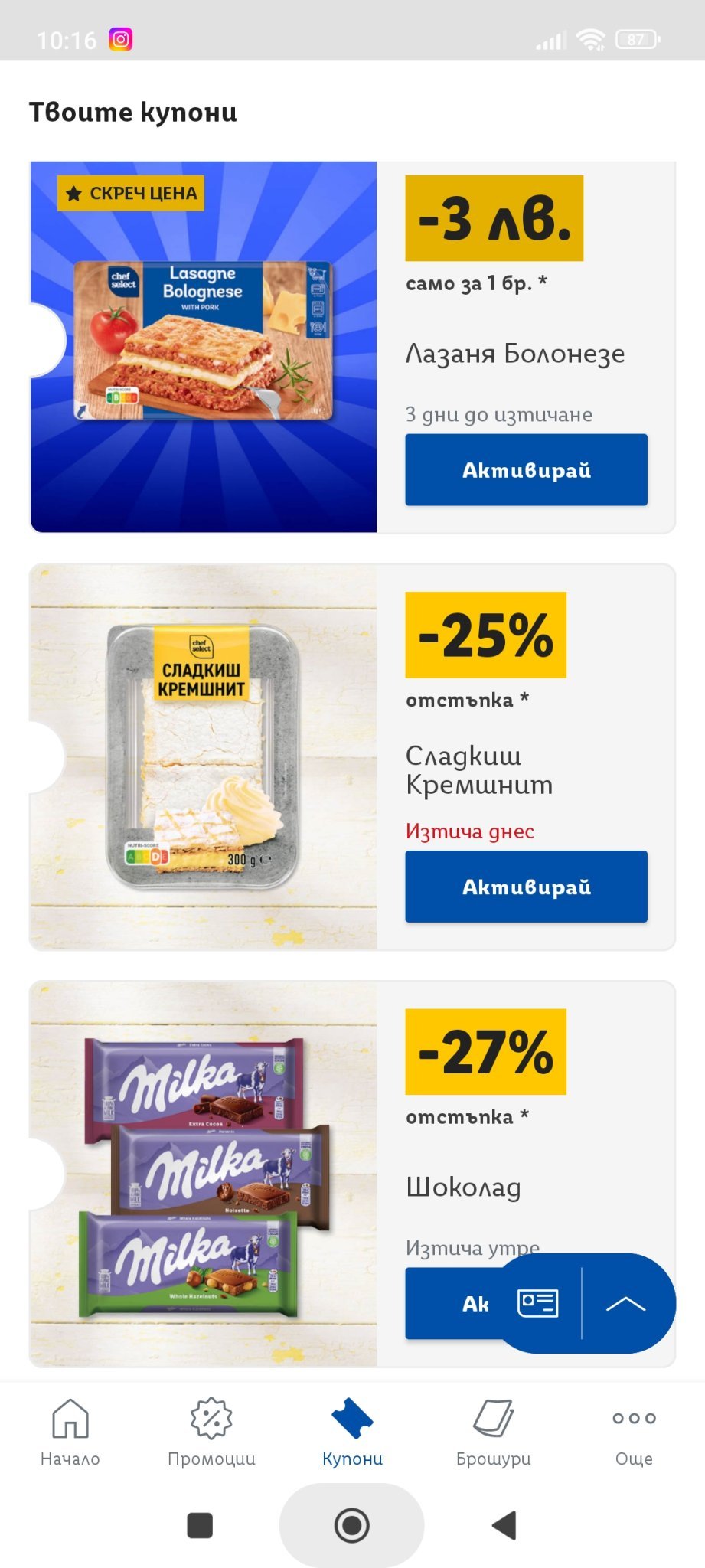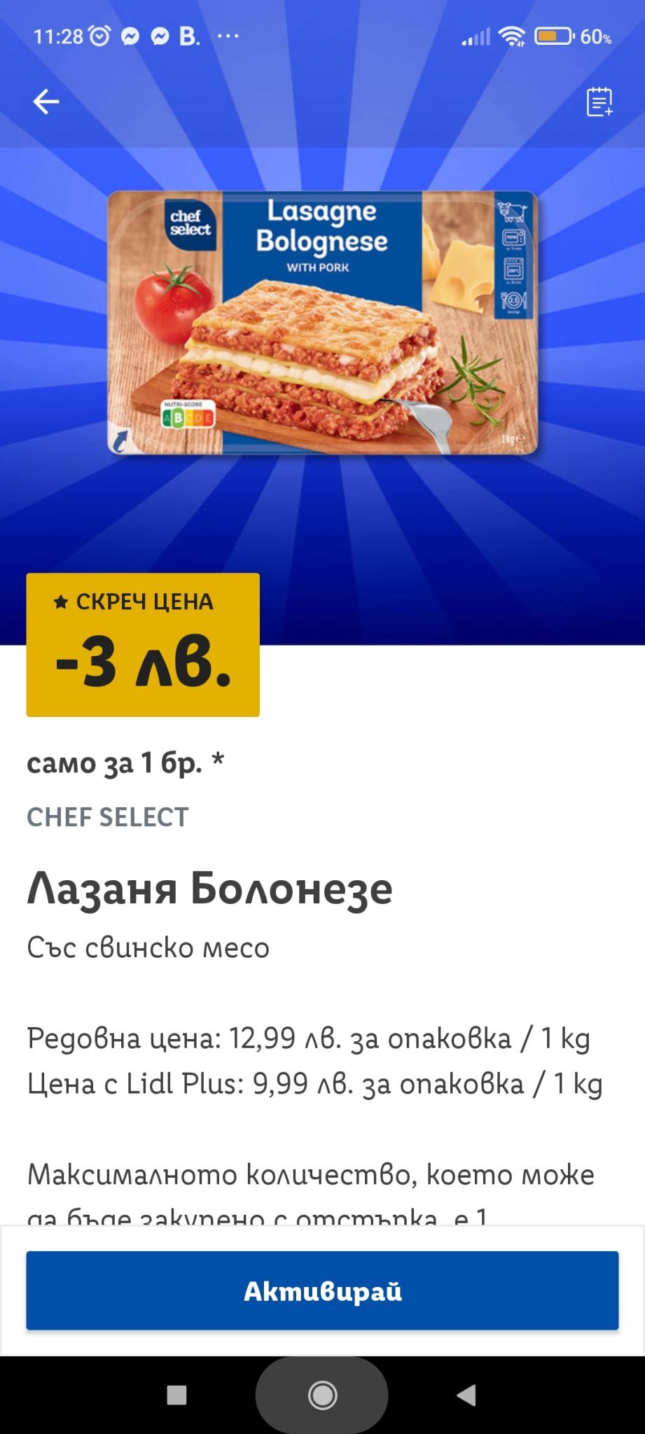 Добавям и от скреча купон за -3лв за Лазаня Болонезе 1кг, 9,99 излиза след отстъпката.
