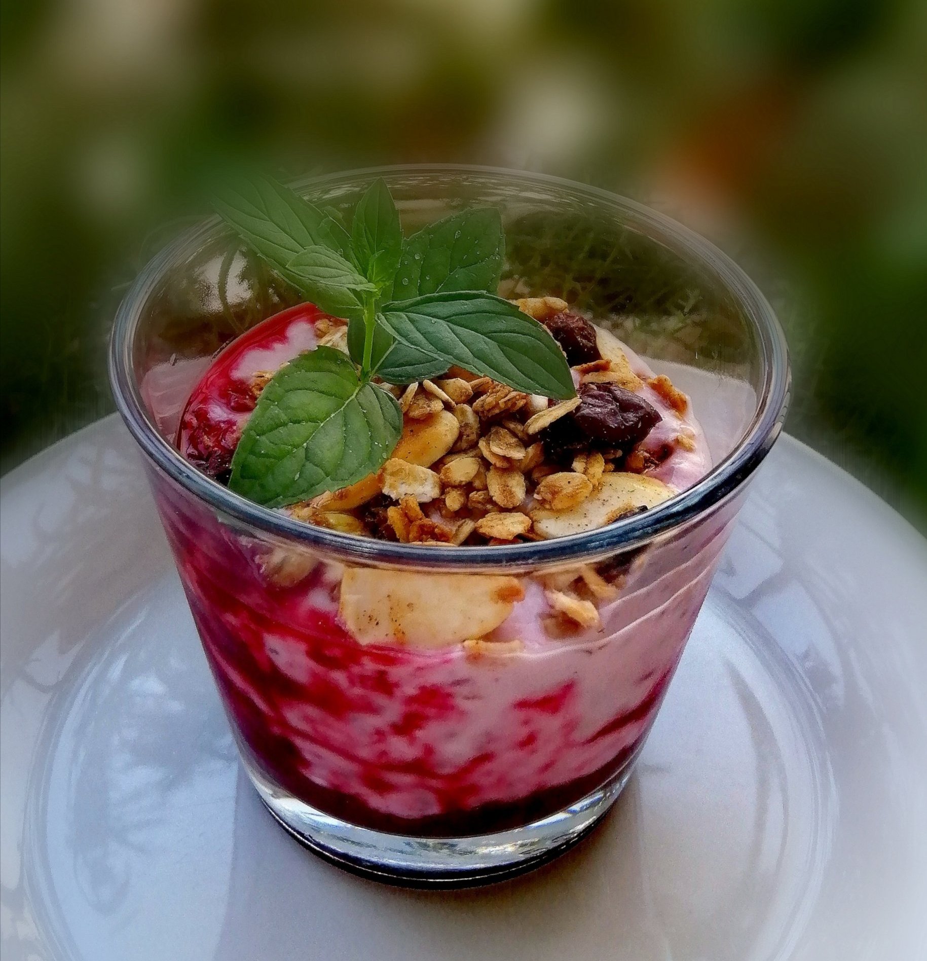 Десерт с кисело мляко, чия, домашно сладко от къпини без захар, с подсладител и домашна гранола: