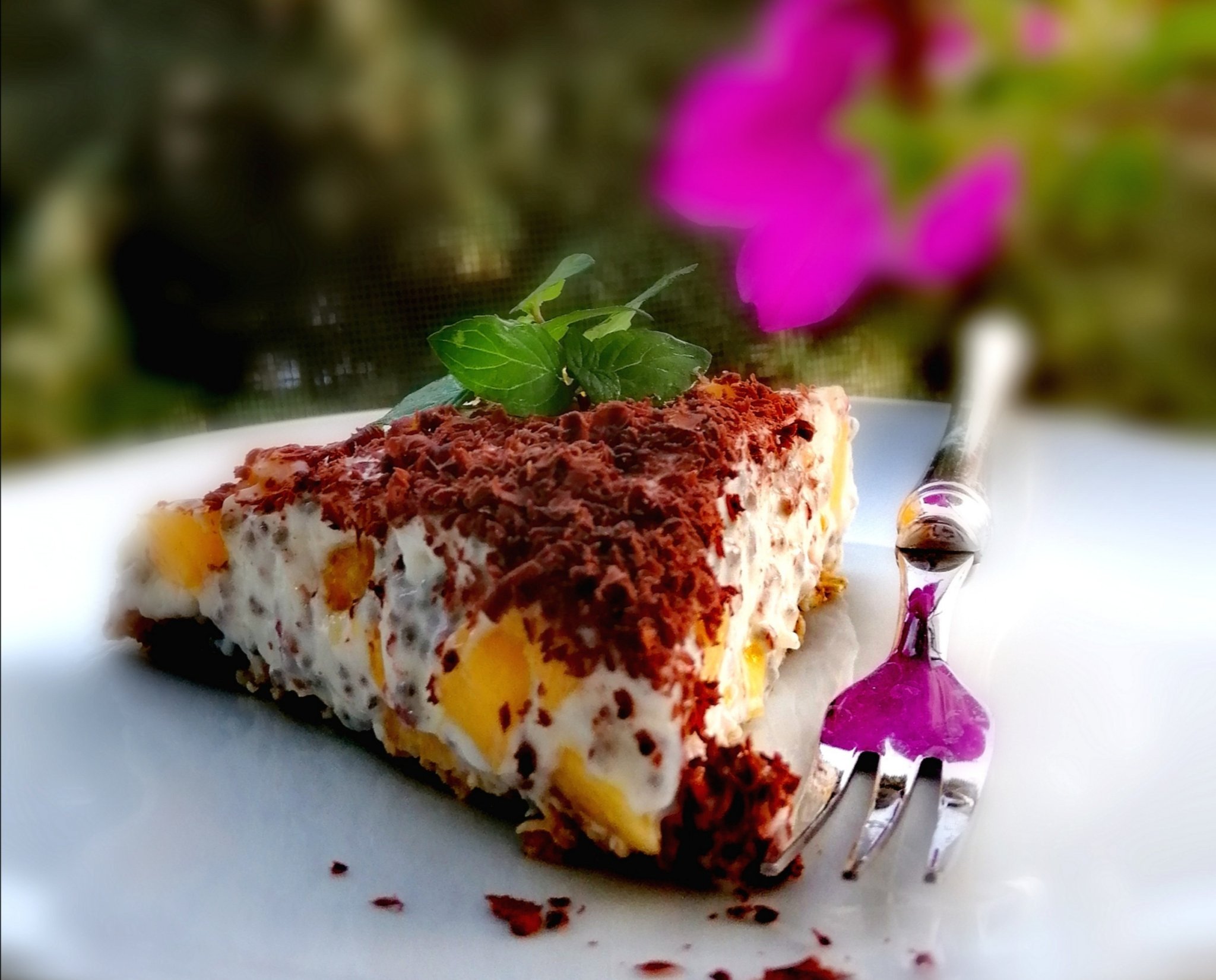 Желиран десерт от кисело мляко, чия, праскова и поръска от черен шоколад: