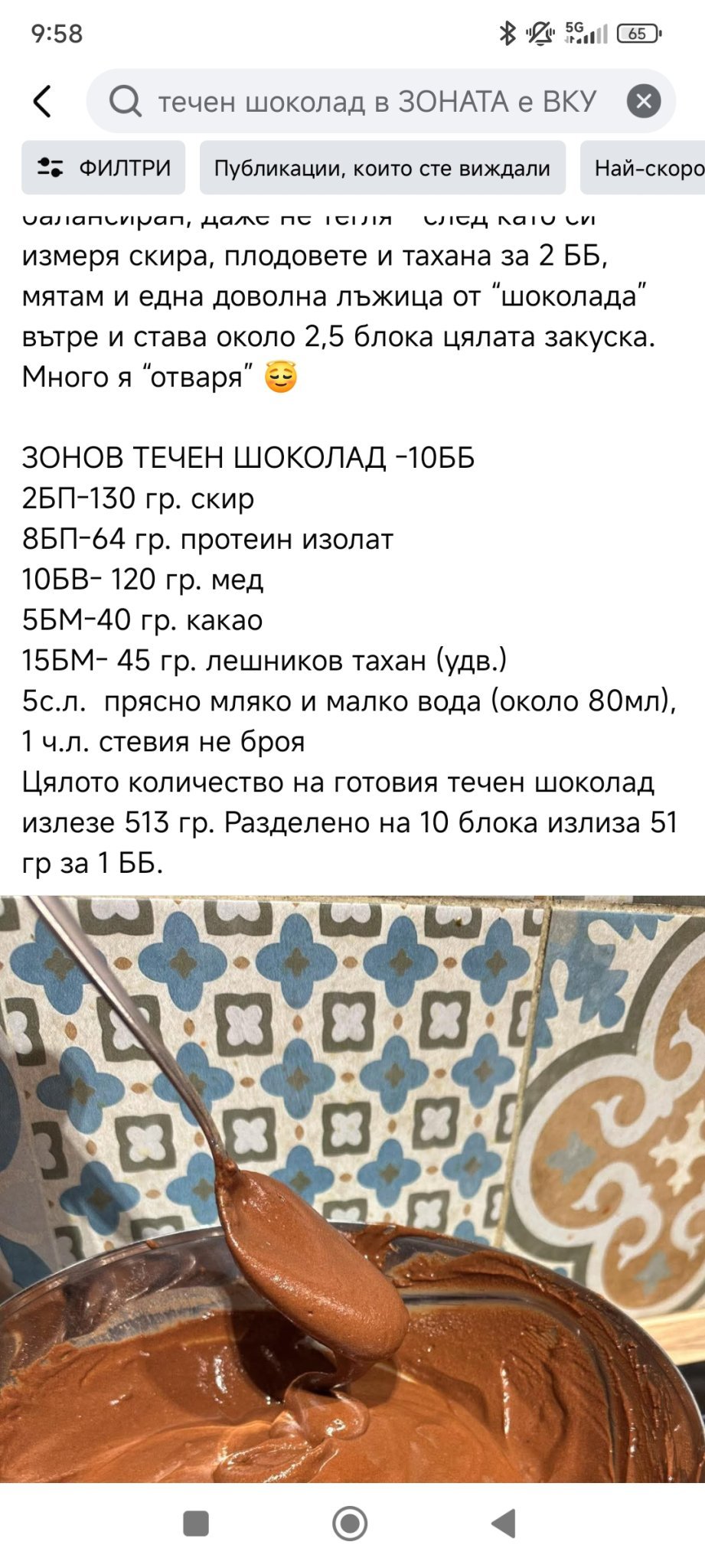 За любителите на сладко - в групата във фейсбук има няколко рецепти за течен шоколад и скоро бърках един. Излиза над 50 гр за блок и когато ми се хапва сладко си гребвам по една мъничка лъжичка ,която е към 10-15 гр съответно изобщо не я броя. Незонуващите вкъщи също го одобриха ,а детето е възхитено че му позволявам филийка с шоколад Joy