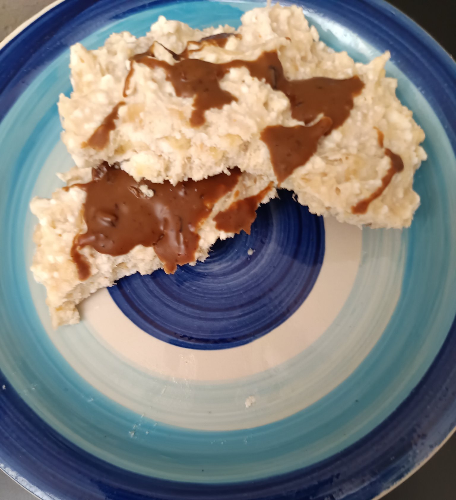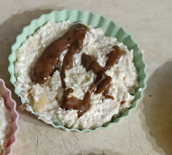 Обърквам и намачквам всичко в купа,ядките ги смлях на булета предварително.Изсипах в тарталетените форми,6 бр. излязоха,понамазах с лешниковия тахан и сложих във фризера за час,после извадих една и изчаках 10 минути.Големият я хареса,леко е студена обаче,ако я оставите в хладилника ще се отпусне.