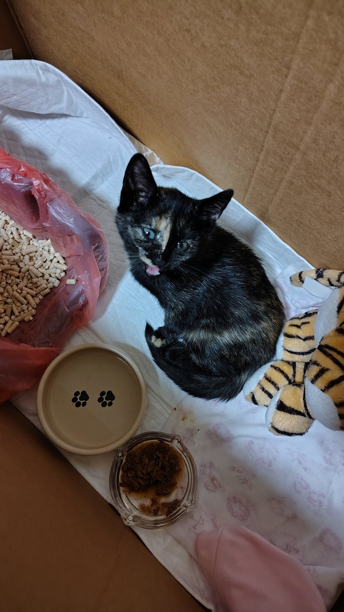 Днес намерих тази котарачка в едни розови храсти, със счупено краче, супер изнемощяла. Не можах да я оставя...