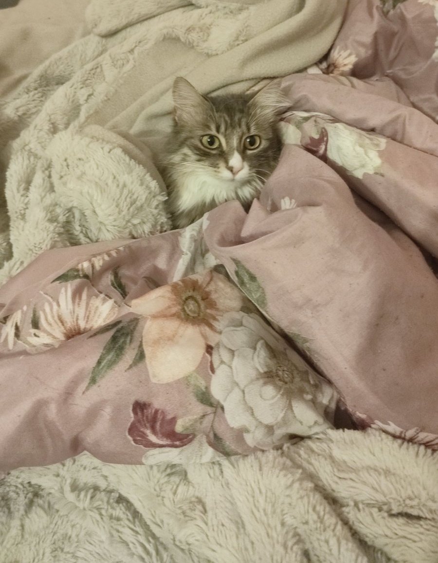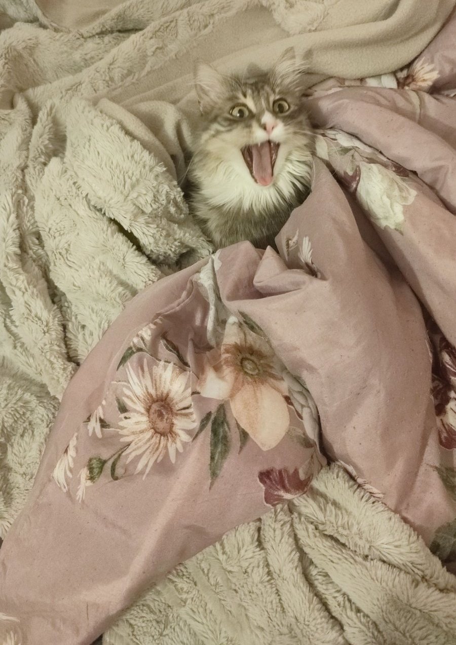 Слива се с фона в неоправеното легло на кака.  Видях я чак като се прозя, иначе си стои кротко и ми гледа сеира. 😄