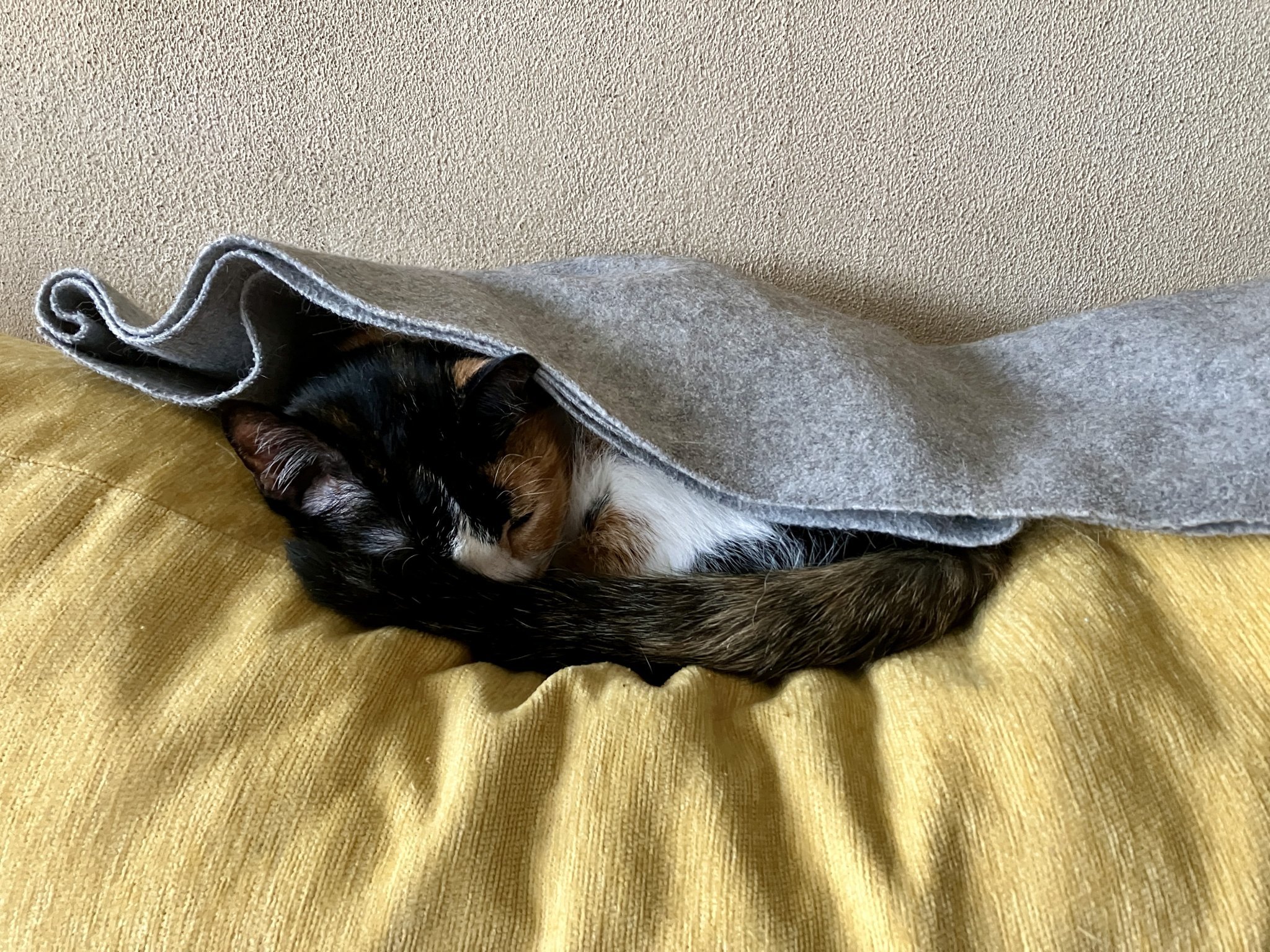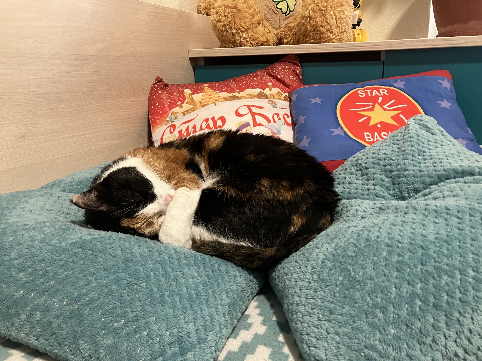 Ех, че деликатно Пиратче. Терата направо налазва и с мъркане и месене  изразява чувства. Но е сговорчива: ако я гушна и отместя до себе си, заспива и ме остава на мира.