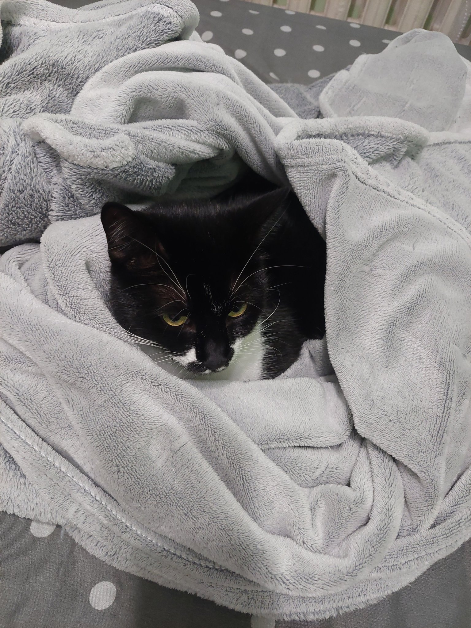И тук времето много застудя и Линош все се навира под завивките, кака и тя само мрънка студено та студено, не мога да ги стопля тез мойте бамбини, та се принудих да купя печка - климатика не става, не топли добре. Взех ииии чудо, аз лудвам от жега, ама търпя, кака е доволна не хленчи, а Линош се размазва от кеф и обръща коремчето нагоре, не е свита на топчица.