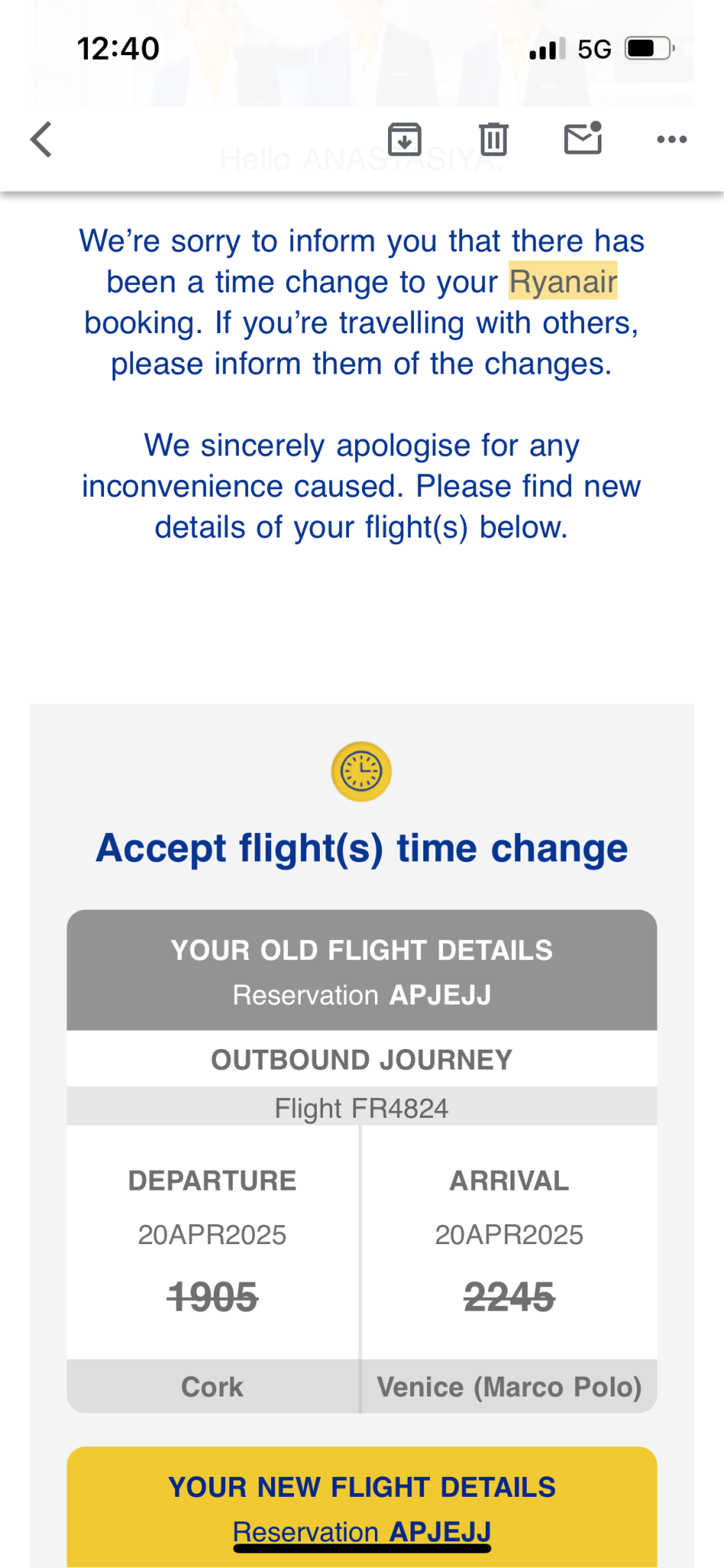 Нямам спомен дали имаше опция да откажа. Беше преди месец. Надолу в имейла продължава с новите часове на излитане и кацане.