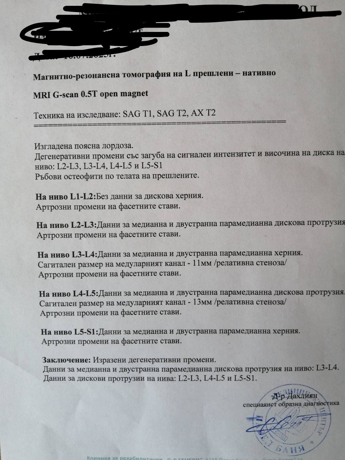 А жената как се чувства като цяло? Държи ли на болките? Движи ли се? Какво работи тя? Това ми прилича на гръбнак на цял живот трудил се усилено човек. Предвид снишаването на дисковете във всички нива, екстензии трябват, но дали водни е въпросът.  Предвид артрозните изменения на всички нива, трябва да се действа също предпазливо и да се пробва да се укрепят ставите с добавки. Може би трябва да се направи консултация с добър физиотерапевт-рехабилитатор за вариантите с екстензиите.