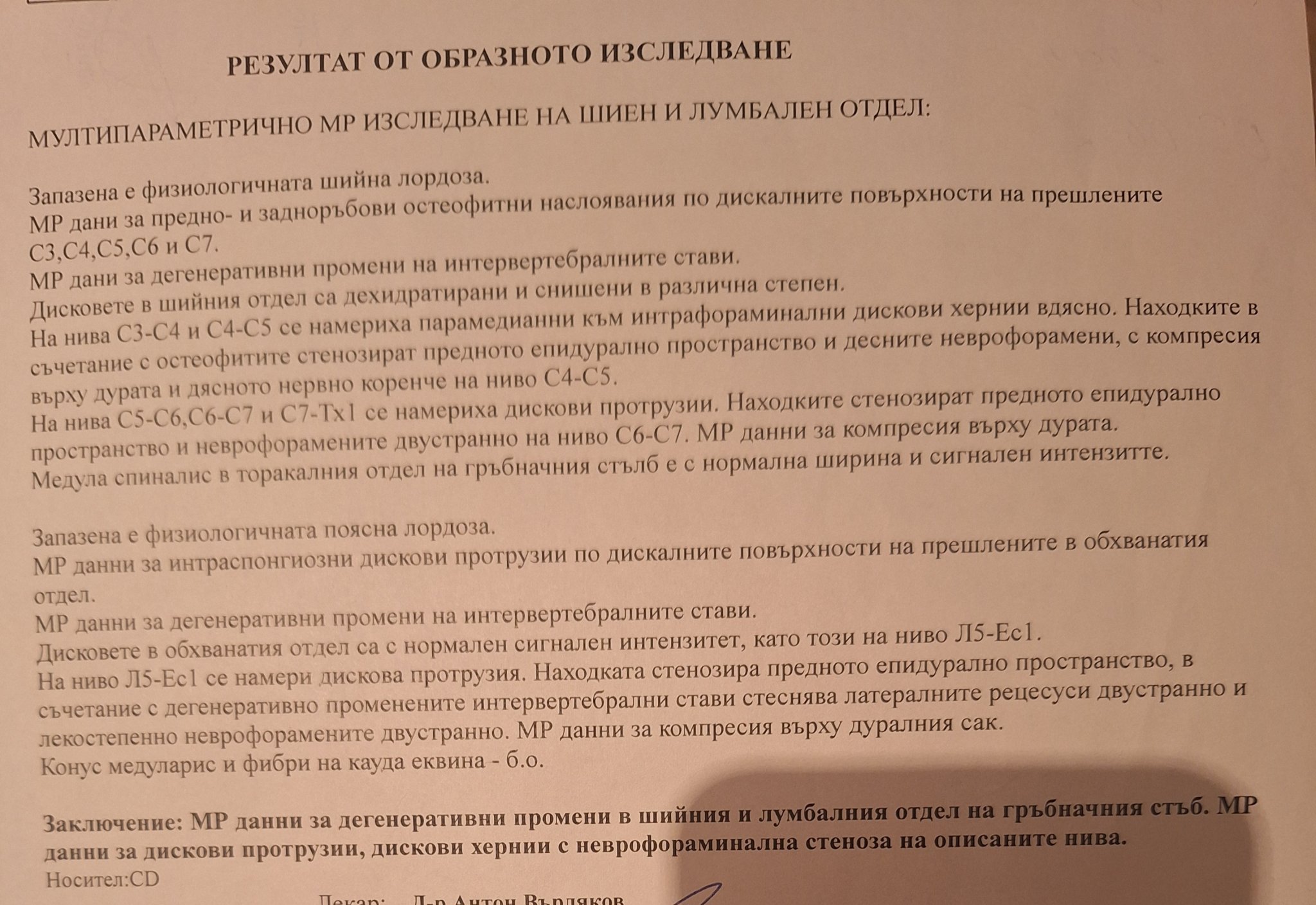 Как успя да се излекуваш и ли по скоро си овладяла симптомите. При мен е същото протрузия и стеснени форамени. Но сиптоматиката ми доскоро бе само сетивна-парене, мравучкане, нарушено оросяване. Две ЕМГ през 8 м.  коренчова увреда на Л5, намалена скорост на сетивните влакна, като и двете са с еднакви показатели. Няма влошаване, няма и подобрение, но симптомите се засилиха и се появи лека болка. Доколкото разбрах било хронично и от тук нататък да се грижа за него.
