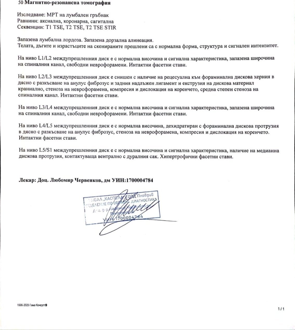 Моят коментар ще е как, за Бога, си е докарал 2 фораминални в дясно и то на нива Л2-3 и Л4-5?! Някаква травма да е претърпял? Това са по-скоро остри изменения, не дегенеративни. Нито ставите са му зле, нито има изкривявания. Затова се чудя как се е докарал с две фораминални в дясно. Леворък ли е? Оплакванията иначе са нормални. Нервните коренчета са притиснати. Ще иска време да оздравеят. Трябва да се подтисне първо локалното възпаление, с противовъзпалителни, за да се освободи място за коренчетата. Стенозата може да е по-големият проблем от самите хернии/протрузии (зависи колко са големи).