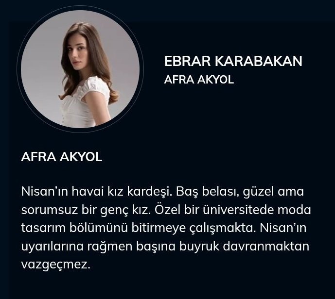 Талантлива музикантка, влюбена в изкуството. Бори се с живота в Истанбул със сестра си Афра. Изключително емоционална, чувствителна, жизнерадостна жена, която не губи детския си дух. Докато се опитва да свърже двата края, се опитва да напредне и в музикалната си кариера