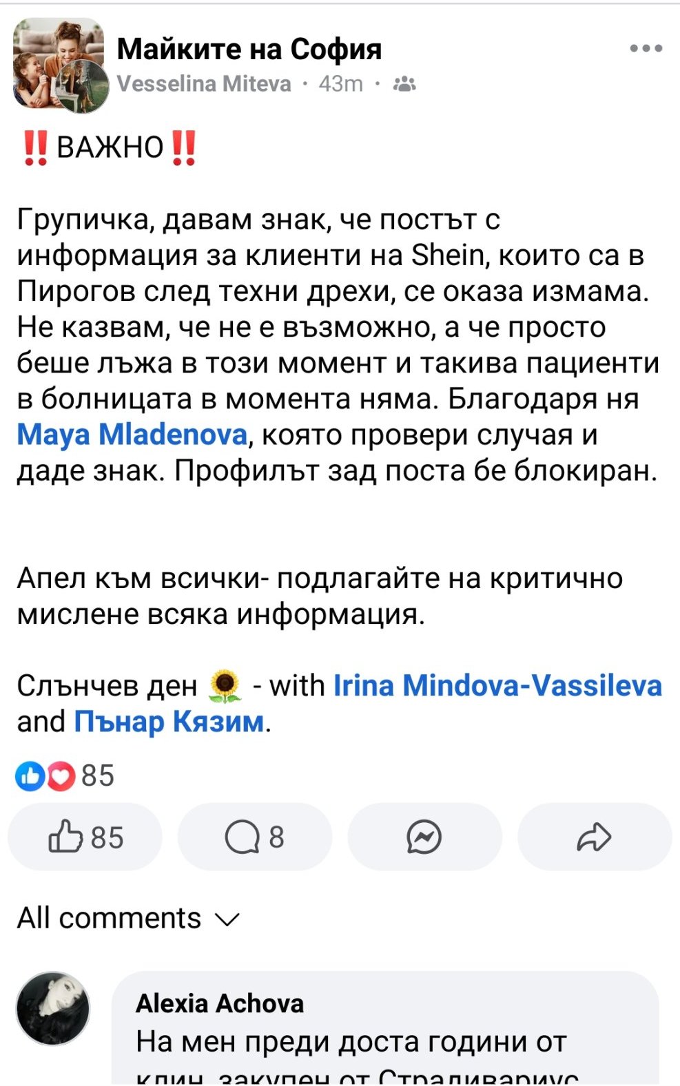 P.S. Видях, че постът за Shein в онази група бил измама и нямало такива пациенти в Пирогов.