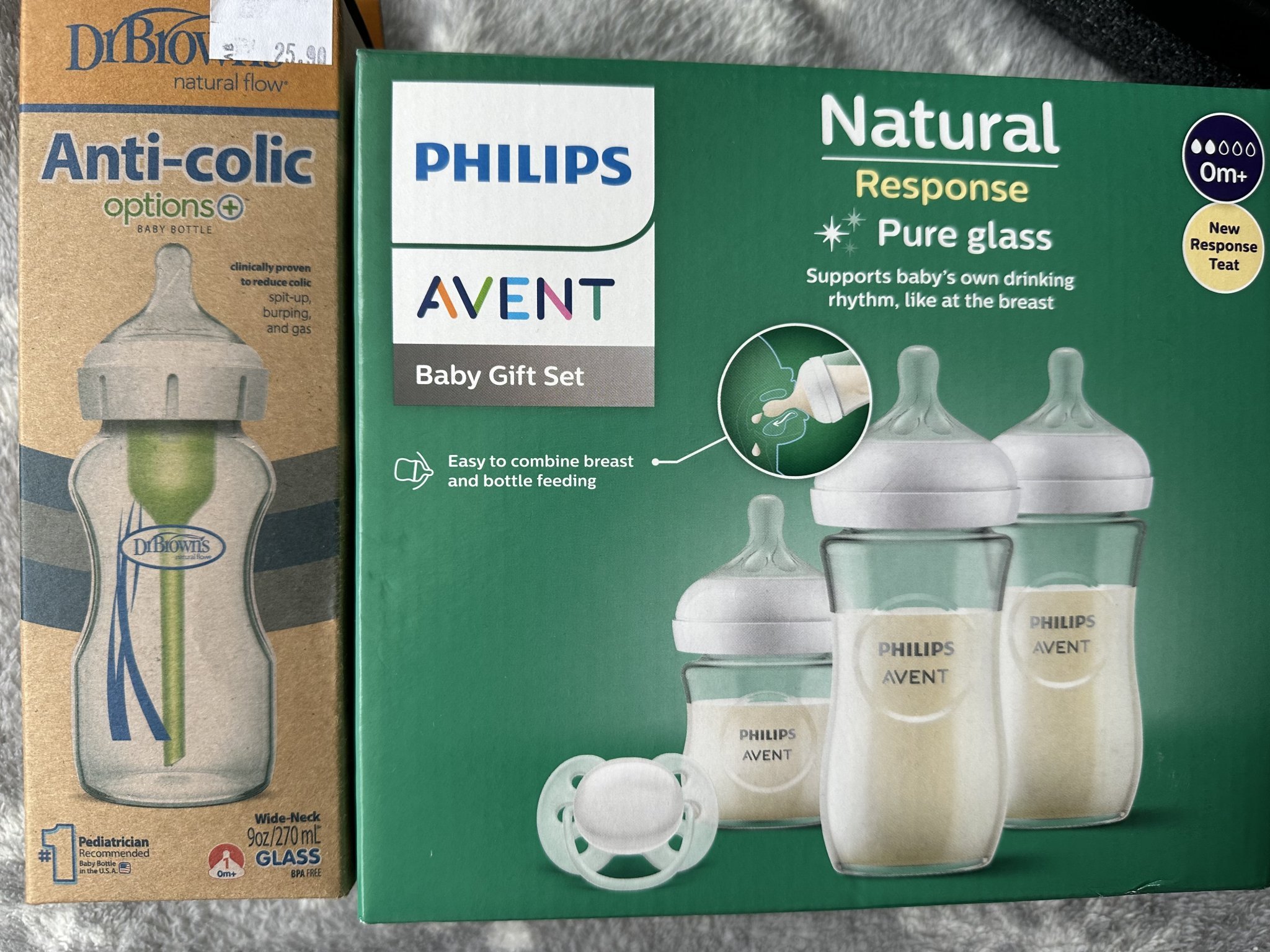 Аз също си взех на Philips комплект шишета 2големи, 2малки (антиколик) и четка имаше подарък към тях. Имам и едмо на Nuk което спечелих от един уебинар- за сега толкова.