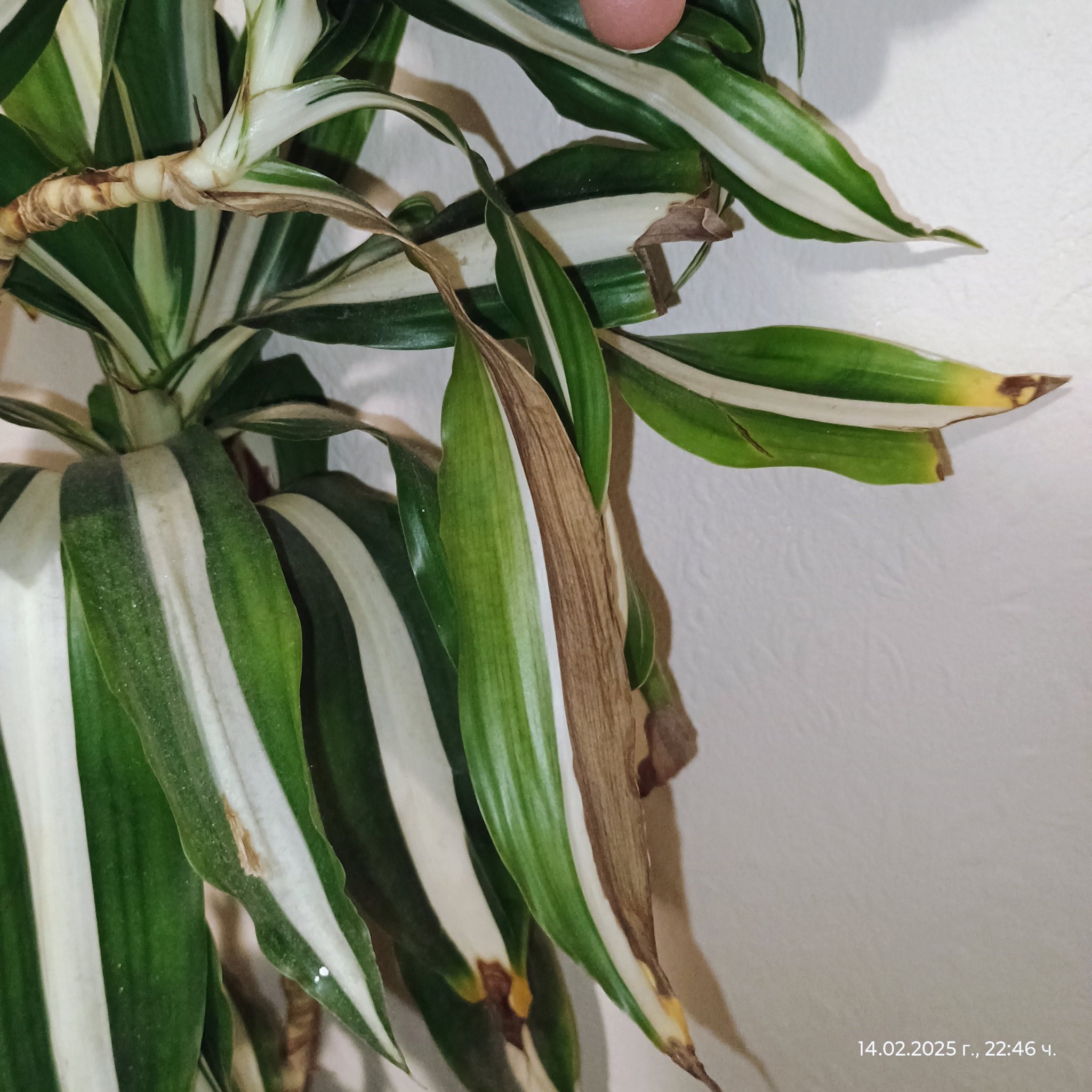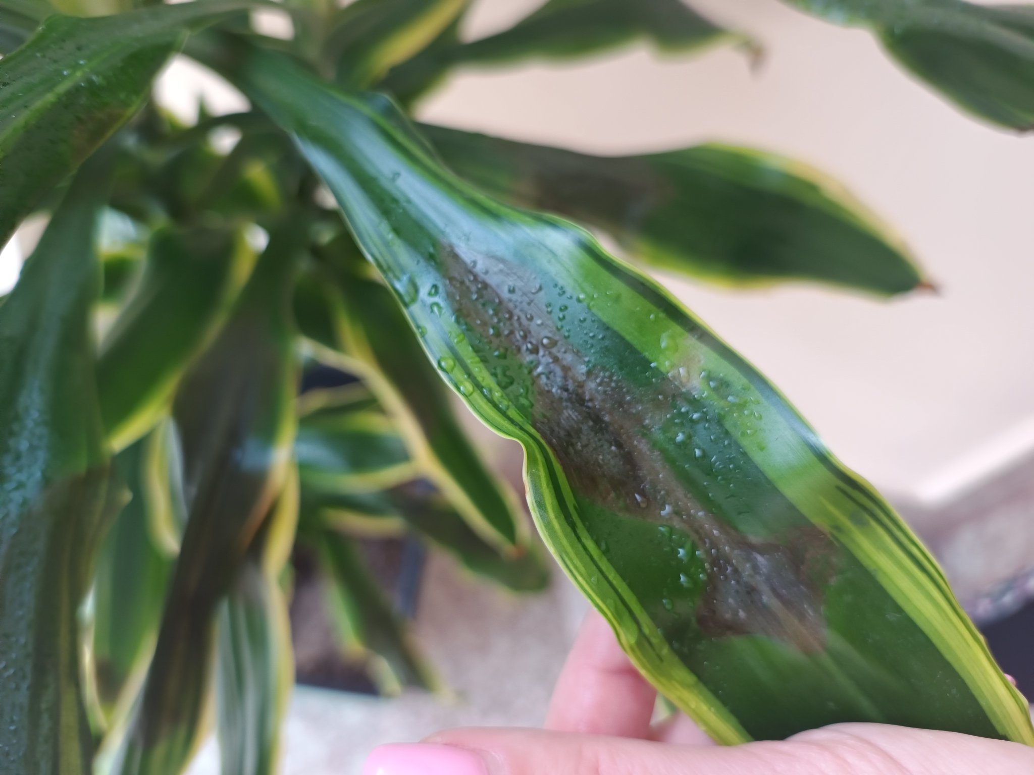 Hataway драцената обича много влажен въздух,но не и постоянно мокри листа и корени.Виждам,че добре е опръскана,ако е и до прозорец,нищо чудно да е изгорена от слънцето.Капките вода отразяват слънцето и се превръщат в лупа,която изгаря листата.