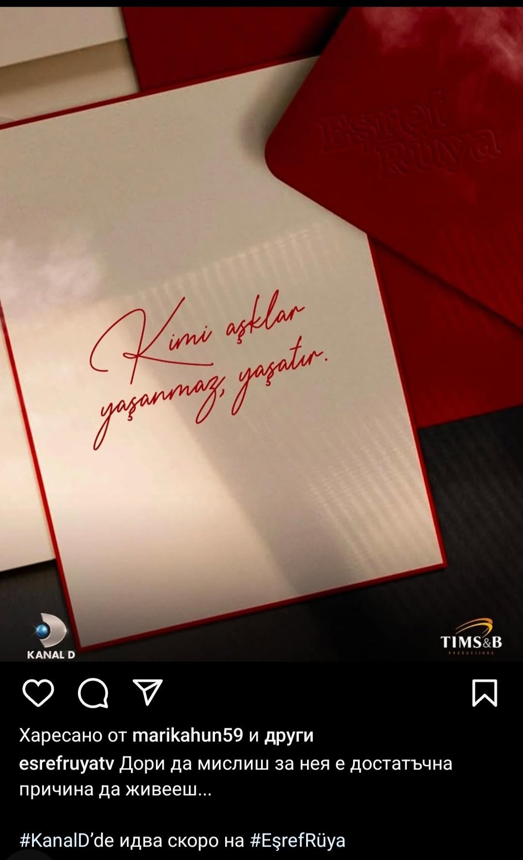 "Eşref Rüya", новият сериал, който предизвиква вълни от вълнение сред феновете, е готов да завладее публиката. Това бележи първото сътрудничество на малкия екран на двете големи турски звезди, Демет Йоздемир и Чагатай Улусой. Сериалът обещава завладяваща история и несравнима химия между двамата талантливи актьори, което го превръща в един от най-очакваните проекти на годината.