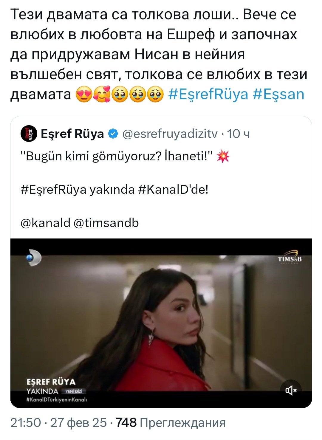 Започна обратното броене за новия сериал на Kanal D „Eşref Rüya“, който се готви да прикове зрителите пред екрана с любовна история, която ще се запечата в съзнанието на всички. Излезе и дългоочакваният трейлър на сериала с участието на Чаатай Улусой и Демет Йоздемир. Със своя голям състав от майсторски актьори и привличащи вниманието кадри, трейлърът на Eşref Rüya привлече голямо внимание за кратко време.