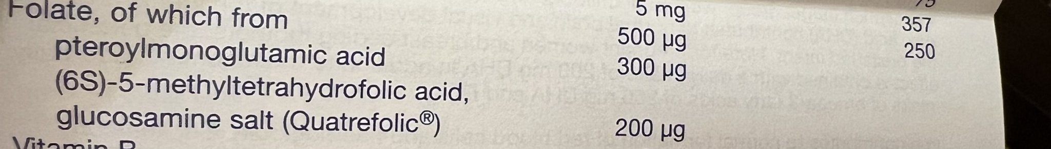 Lia white, не съм напълно сигурна за формата на фолиевата киселина във витамините, ако правилно се ориентирам - част от нея е метилирана. Ето това е отразено в съдържанието: