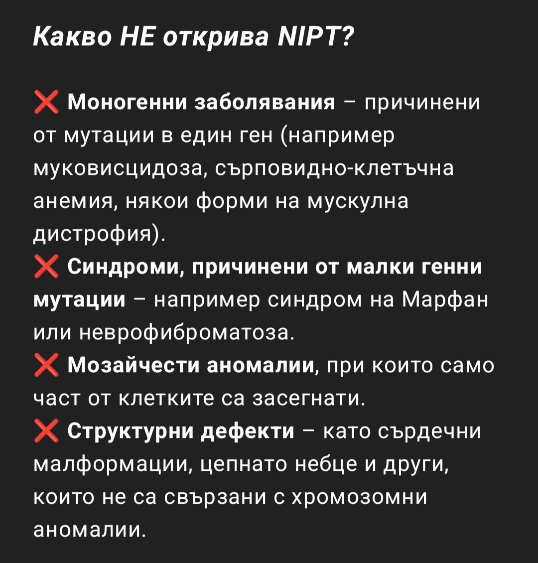 Докторът ми на ФМ, на който имам 1000% доверие, спомена, че и тези тестове са диагностични и чисто количествени. Дори да покажат, че всичко е ОК с хромозомните двойки, те не могат да уловят, ако някъде има качествена липса на отрязък на някоя тях и отново се явяват ненадеждни, по-скоро добре маркетирани. Обяснявам го леко лаишки, но това бе основната идея.