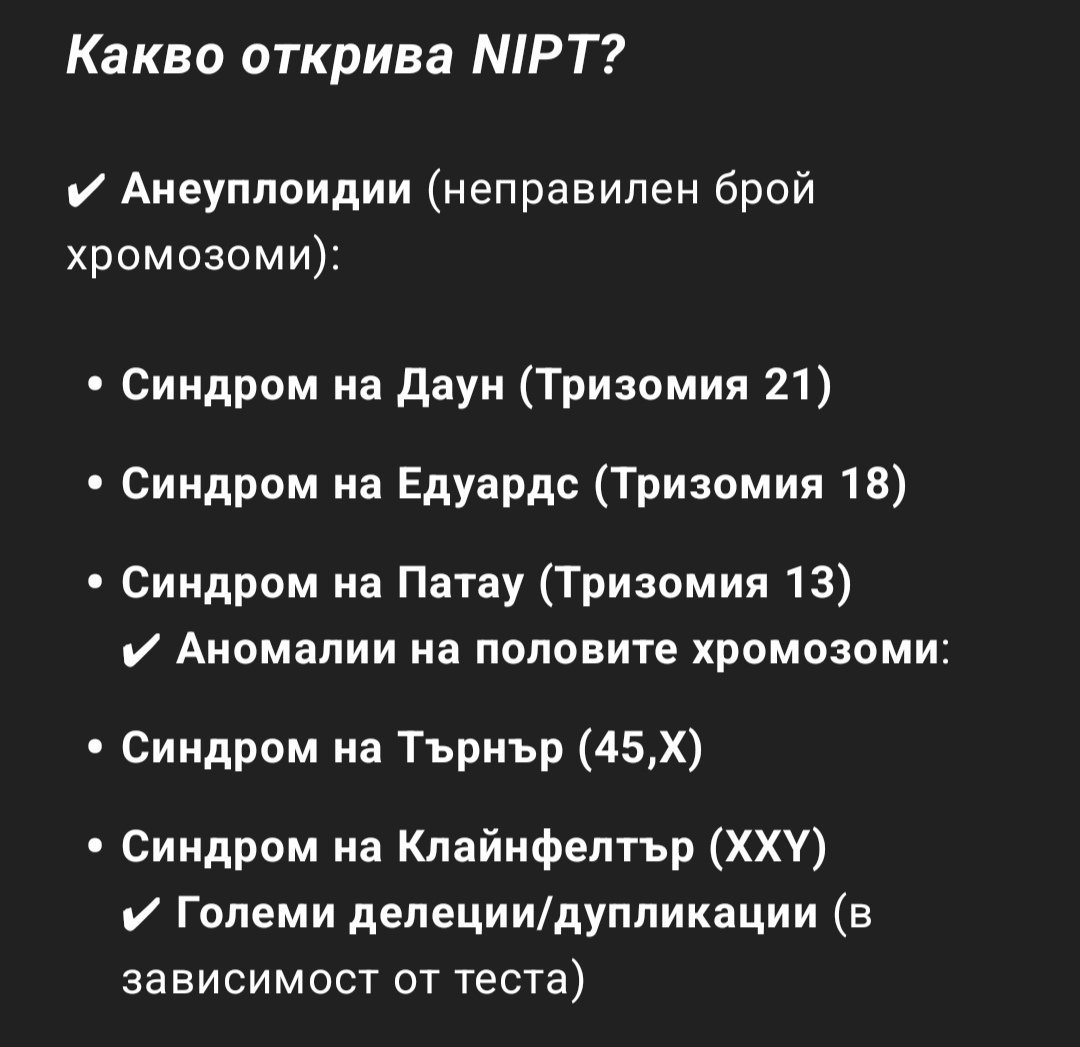 Аз пуснах този понеделник в Cell Genetics Niptify и съм в очакване на резултати Simple Smile Много ми хареса отношението - отиваш, предлагат ти вода, шоколадче, обясняват ти всичко, отговарят на въпросите ти, дават ти документи. Имат генетик, с който можеш да обсъдиш резултатите ако бъде открита находка и така Simple Smile Нямам вече търпение 😁