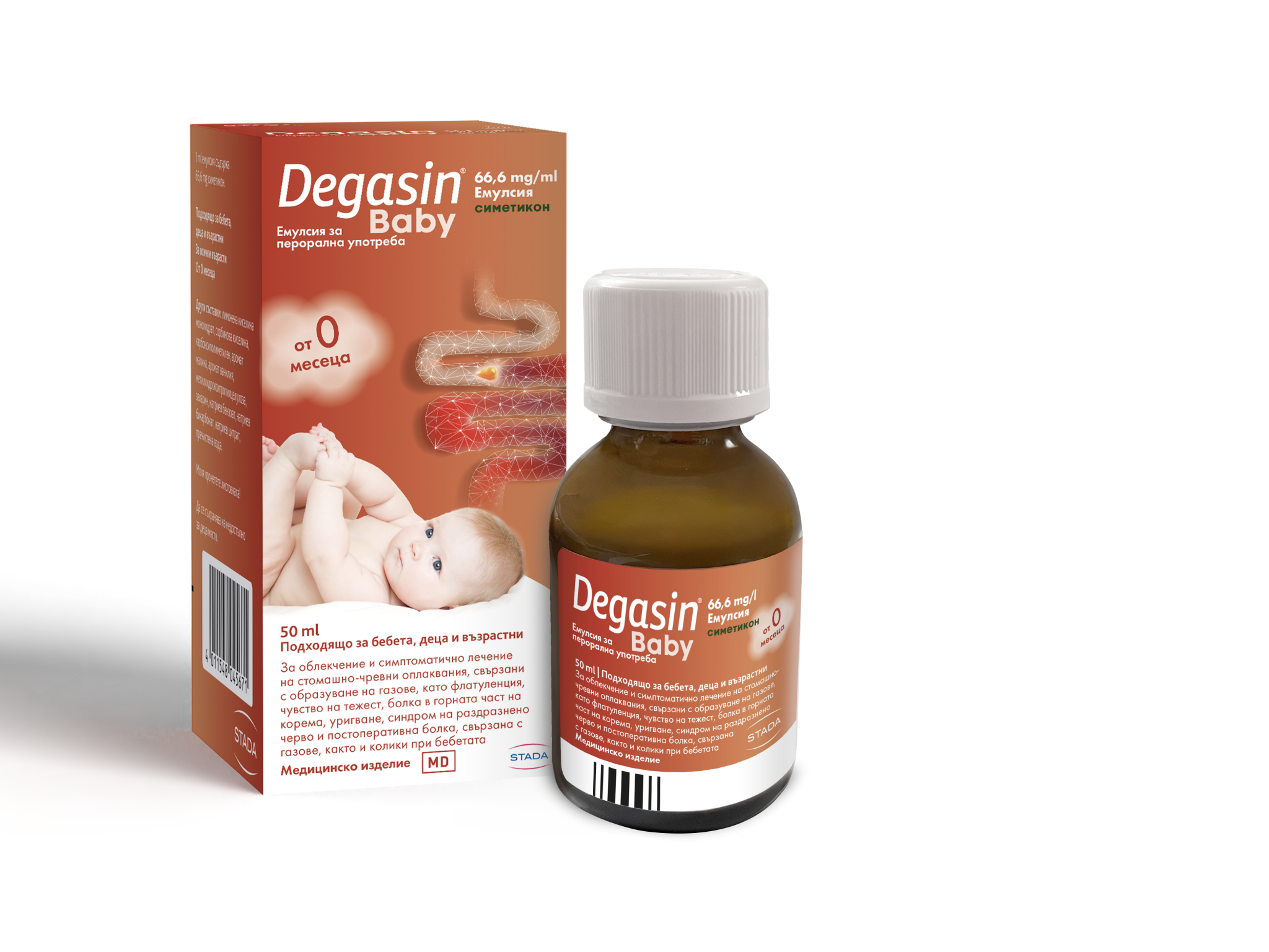 За да облекчите коремчето на вашето бебе на помощ идва DEGASIN® Baby 66,6 mg/ml емулсия симетикон - медицинско изделие за облекчение и симптоматично лечение на колики при бебетата, както и на стомашно-чревни оплаквания, свързани с образуване на газове, като флатуленция, чувство на тежест, болка в горната част на корема, оригване, синдром на раздразнено черво и постоперативна болка, свързана с газове.