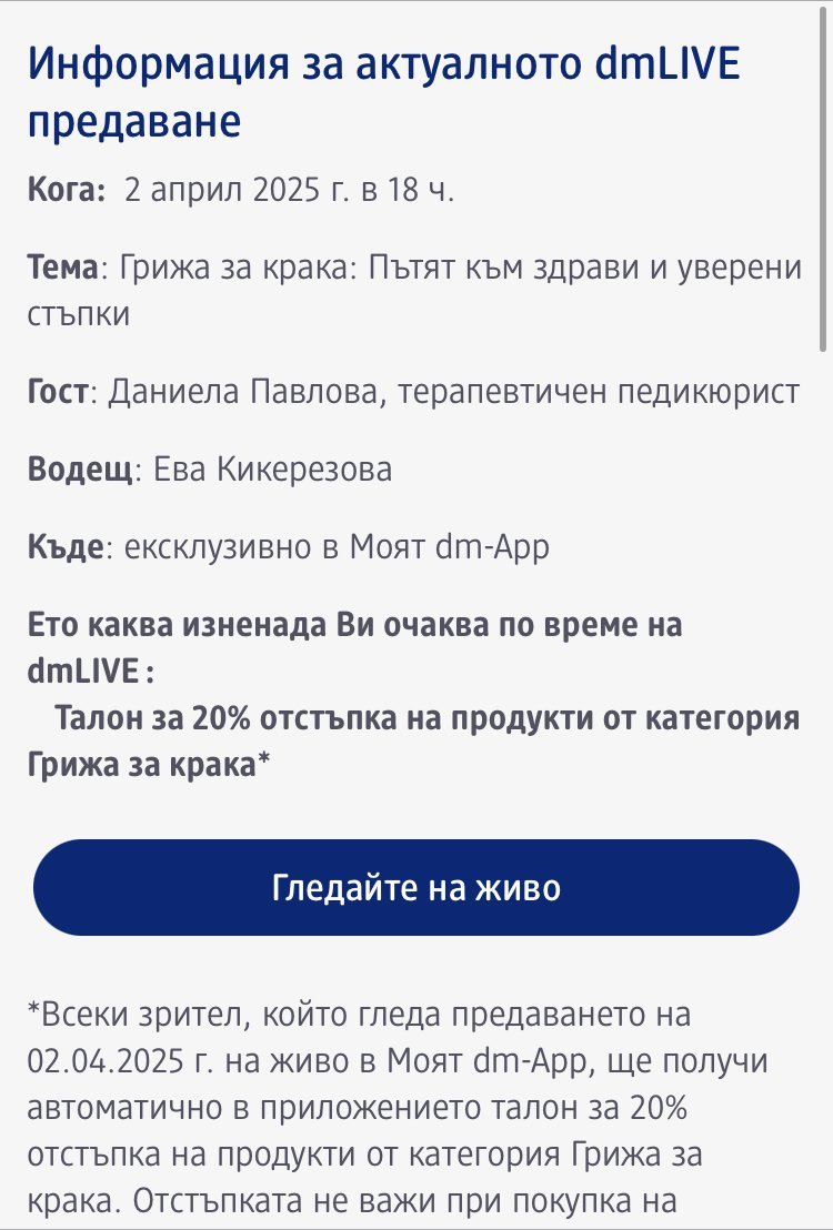 Ще има лайф на 2-ри в приложението и талон за 20% отстъпка на продукти в категория крака.