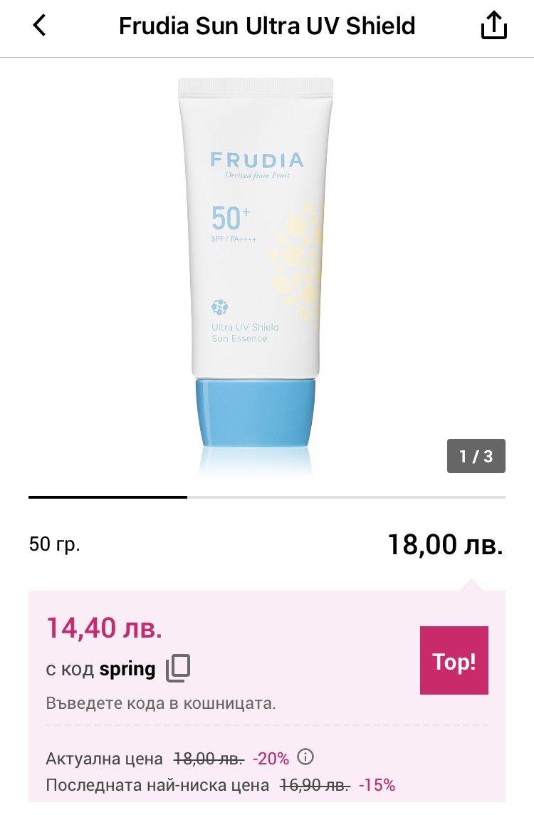 Купувам предимно Biotrade pure skin SPF 50, на намаление е 23-24лв. Не е бюджетна, но гледам, че и споделените в темата, които са от дрогерията минават 30лв.В момента използвам тази слънцезащита и съм доволна от нея, ще купя пак. Гледам я обикновено е на цена около 15лв., но купувам от Нотино или Мейкъп, не виждала продуктите на Frudia в ДМ и Лили.