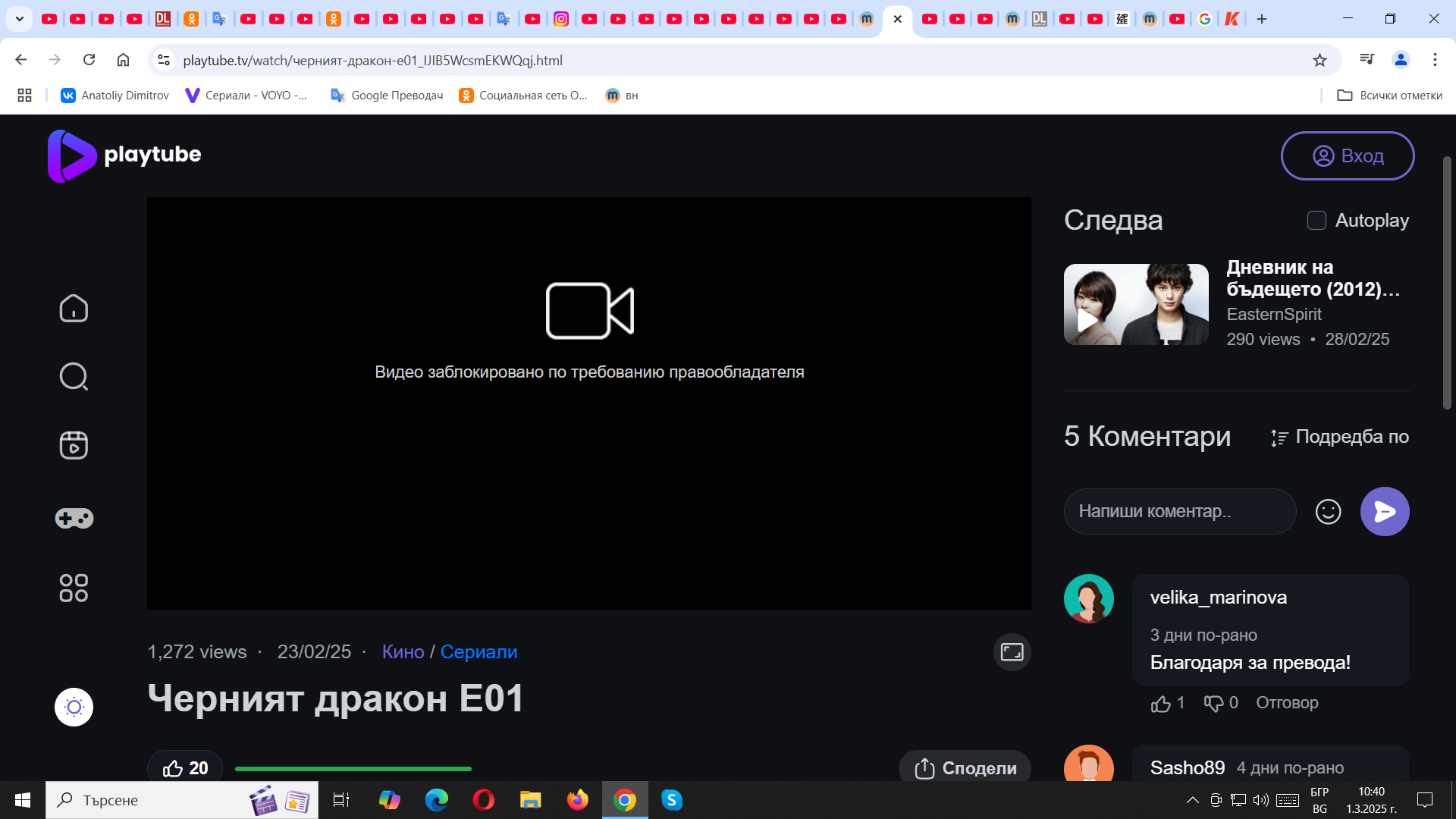 Тъкмо се зарадвах че Черния дракон го ичма в Плейтюба  и ми излезе надпис че е блокиран, ужас дано не започнат да блокират и други сериали.