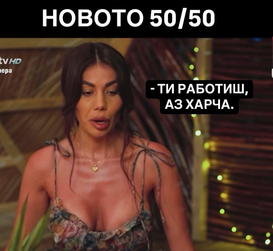 Любомира? Аз изобщо не я харесвам, но тя по дяволите е актриса, а той това учи. Режисьор искал да става. Ами ако режисира целия сезон и играта си във формата? Хм? Защото да речем се знаят с жената с торбичките от някоя сцена и може да са решили да използват формата като трамплин за кариерите им? Иначе аз химия между тях не виждам. И тя стои като лелка до него.