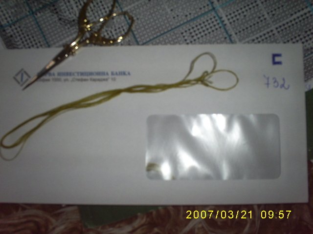 tuli с конците правя така: ако имам много чилета от един цвят/като "Тайната вечеря"/, ги отделям в найлонов плик и си взимам само едно чиле! Него го разделям на 4 равни части/шия с много дълги конци/ и го поставям в пощенски плик, като отгоре пиша знака!  Peace Това с картончетата ми е много гадно!  Confused