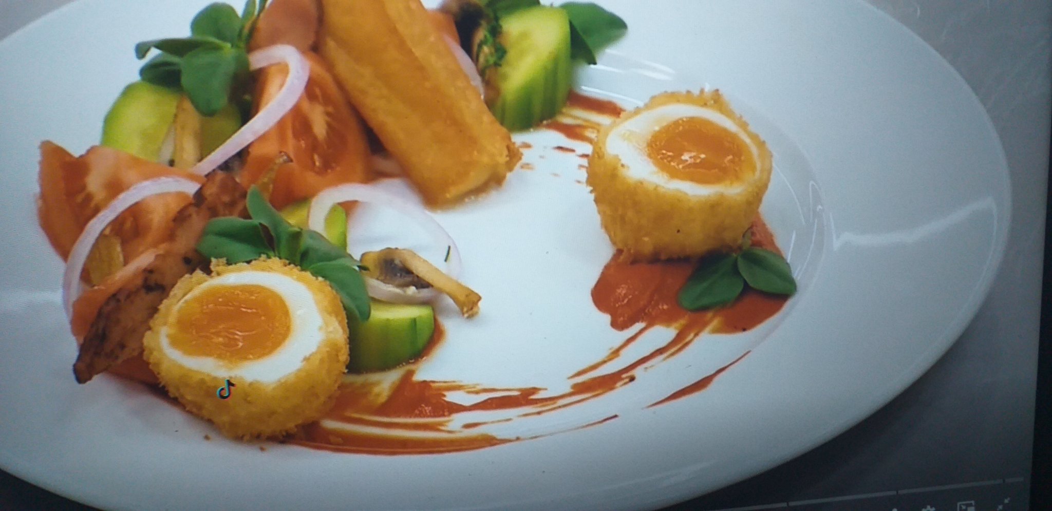 Трябва да свариш,охладиш, обелиш, панираш и изпържиш яйце, междувременно и кашкавал пане, май и гъбите са с топлинна обработка, дресинг, зеленчуци и плейтване. Не е лесно.